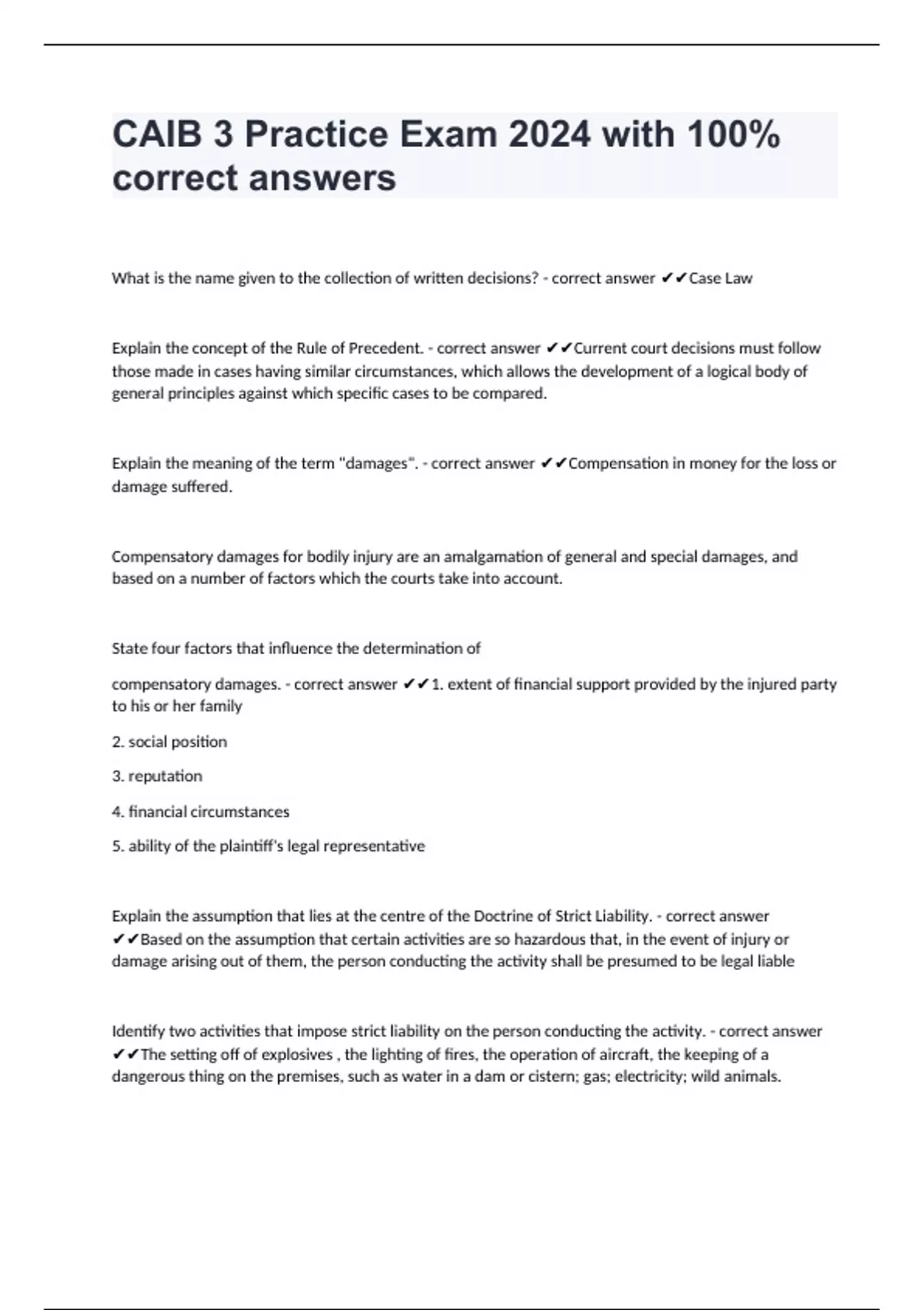 What is the name given to the collection of written decisions? - correct answer Case Law Explain the concept of the Rule of Precedent. - correct answer Current court decisions must follow those made in cases having similar circumstances, which allows the development of a logical body of general principles against which specific cases to be compared. Explain the meaning of the term "damages". - correct answer Compensation in money for the loss or damage suffered. Compensatory damages for bodily injury are an amalgamation of general and special damages, and based on a number of factors which the courts take into account. State four factors that influence the determination of compensatory damages. - correct answer 1. extent of financial support provided by the injured party to his or her family 2. social position 3. reputation 4. financial circumstances 5. ability of the plaintiff's legal representative Explain the assumption that lies at the centre of the Doctrine of Strict Liability. - correct answer Based on the assumption that certain activities are so hazardous that, in the event of injury or damage arising out of them, the person conducting the activity shall be presumed to be legal liable Identify two activities that impose strict liability on the person conducting the activity. - correct answer The setting off of explosives , the lighting of fires, the operation of aircraft, the keeping of a dangerous thing on the premises, such as water in a dam or cistern; gas; electricity; wild animals.