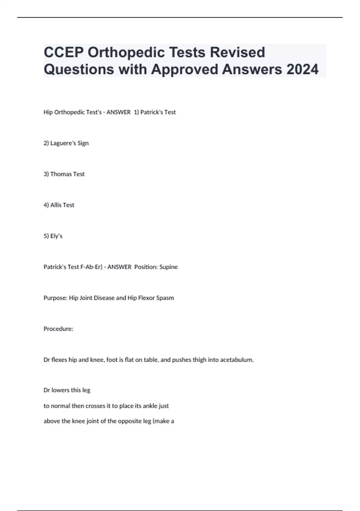CCEP Orthopedic Tests Revised Questions with Approved Answers 2024 Hip Orthopedic Test's 1) Patrick's Test 2) Laguere's Sign 3) Thomas Test 4) Allis Test 5) Ely's Patrick's Test F-Ab-Er) Position: Supine Purpose: Hip Joint Disease and Hip Flexor Spasm Procedure: Dr flexes hip and knee, foot is flat on table, and pushes thigh into acetabulum. Dr lowers this leg to normal then crosses it to place its ankle just above the knee joint of the opposite leg (make a figure 4). Dr stabilizes the contralateral ASIS and presses bent knee A->P Positive: Positive when test leg remains above opposite leg. Pain or decreased ROM = hip joint pathology (sprain/strain, iliopsoas spasm, bursitis). Pain low back may be SI joint lesion Laguere's Test Position: Supine Purpose: Tests hip joint lesion Procedure: Pt flexes bad knee and hip. Dr stands on symptomatic side, stabilizes opposite ASIS, and abducts & ext. rotates hip applying pressure at end ROM. Compressive forces added to acetabulum. Positive: Positive for non-specified hip pathology if there is a pain in SI joint