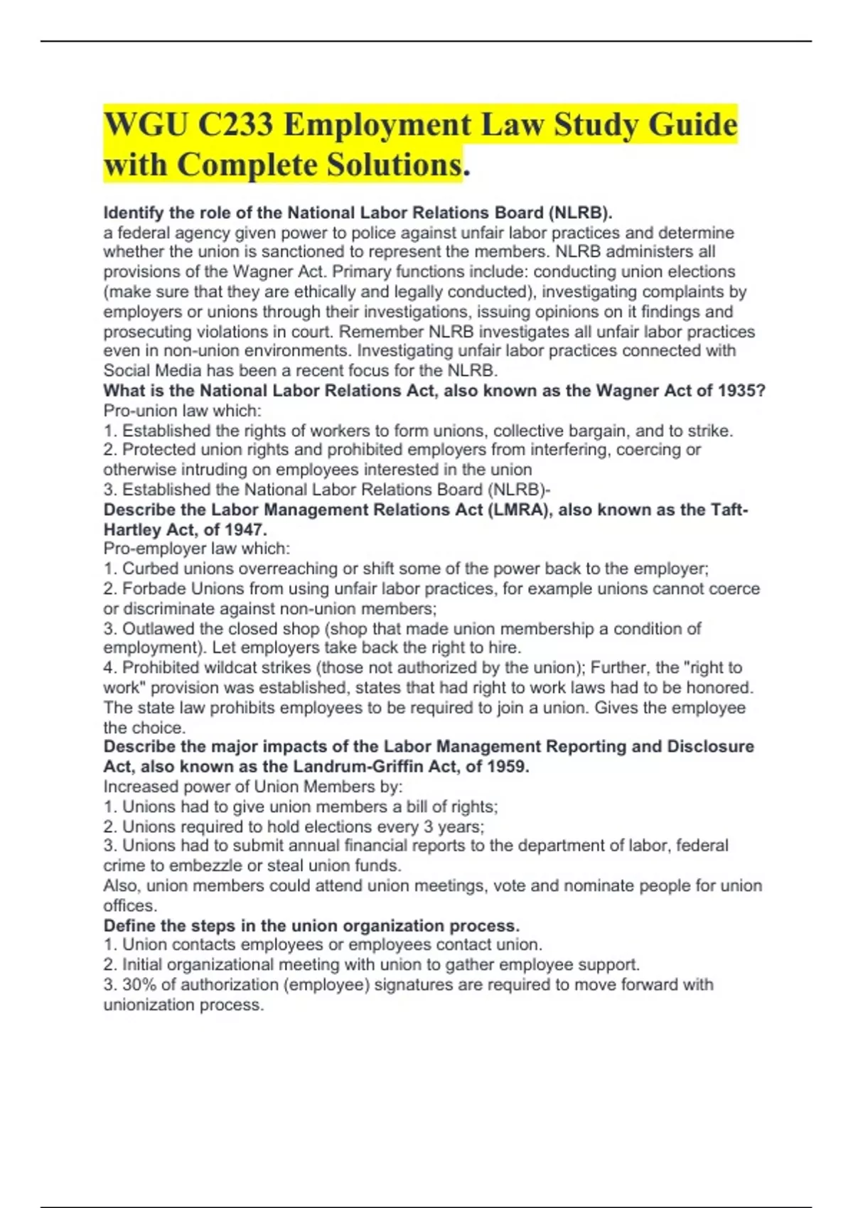WGU C233 Employment Law Study Guide with Complete Solutions.