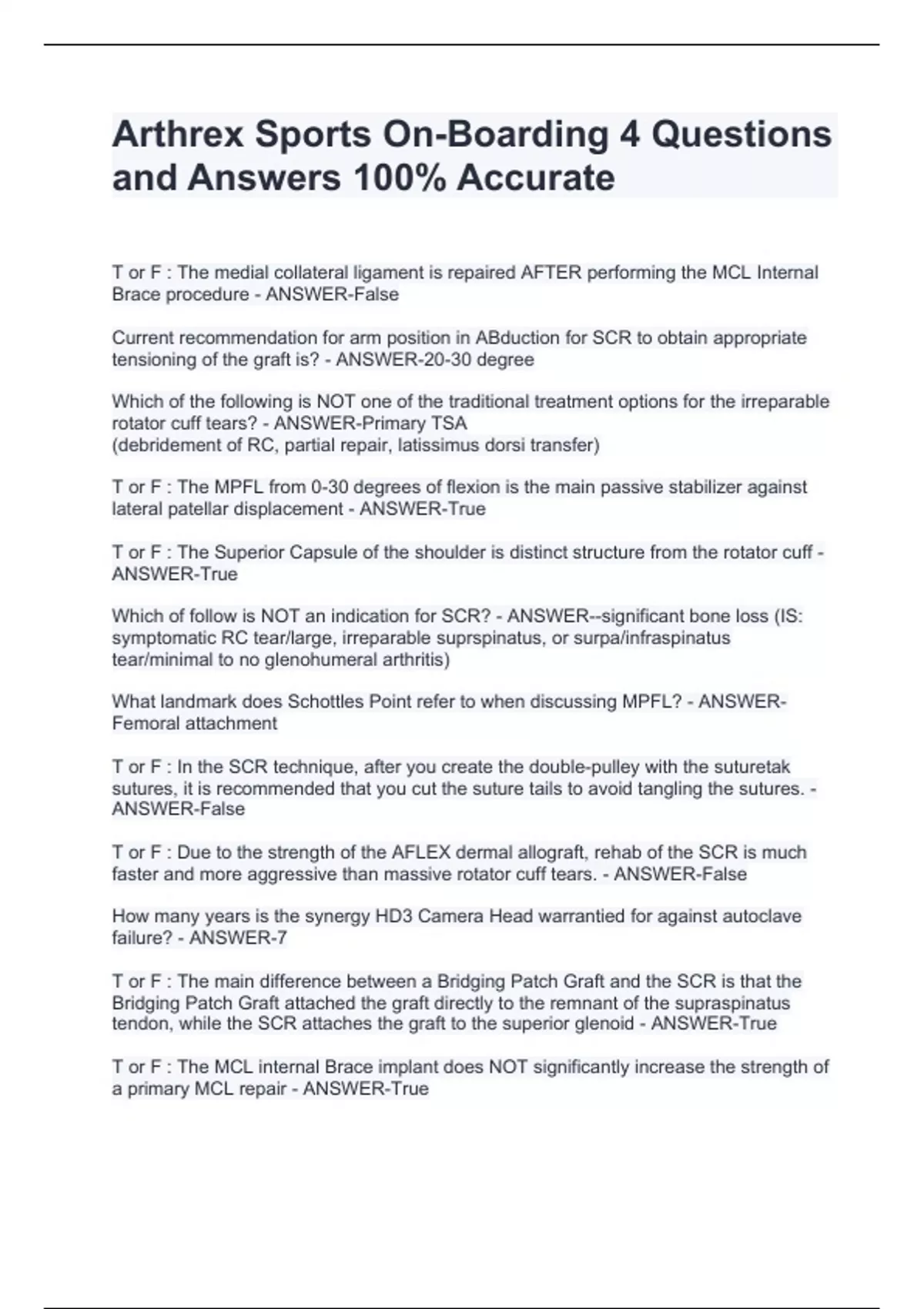 Arthrex Sports On-Boarding 4 Questions and Answers 100% AccurateArthrex Sports On-Boarding 4 Questions and Answers 100% AccurateArthrex Sports On-Boarding 4 Questions and Answers 100% AccurateArthrex Sports On-Boarding 4 Questions and Answers 100% Accurate T or F : The medial collateral ligament is repaired AFTER performing the MCL Internal Brace procedure - ANSWER-False Current recommendation for arm position in ABduction for SCR to obtain appropriate tensioning of the graft is? - ANSWER-20-30 degree Which of the following is NOT one of the traditional treatment options for the irreparable rotator cuff tears? - ANSWER-Primary TSA (debridement of RC, partial repair, latissimus dorsi transfer)