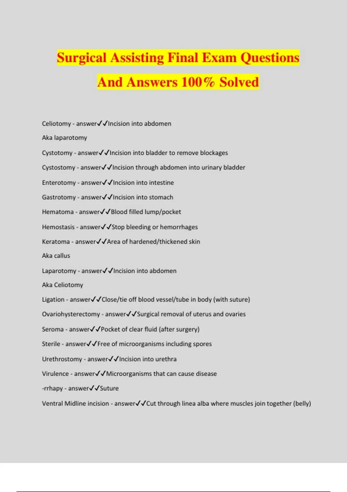 Surgical Assisting Final Exam Questions And Answers 100% Solved Celiotomy - answerIncision into abdomen Aka laparotomy Cystotomy - answerIncision into bladder to remove blockages Cystostomy - answerIncision through abdomen into urinary bladder Enterotomy - answerIncision into intestine Gastrotomy - answerIncision into stomach Hematoma - answerBlood filled lump/pocket Hemostasis - answerStop bleeding or hemorrhages Keratoma - answerArea of hardened/thickened skin Aka callus Laparotomy - answerIncision into abdomen Aka Celiotomy Ligation - answerClose/tie off blood vessel/tube in body (with suture) Ovariohysterectomy - answerSurgical removal of uterus and ovaries Seroma - answerPocket of clear fluid (after surgery) Sterile - answerFree of microorganisms including spores Urethrostomy - answerIncision into urethra Virulence - answerMicroorganisms that can cause disease -rrhapy - answerSuture Ventral Midline incision - answerCut through linea alba where muscles join together (belly)