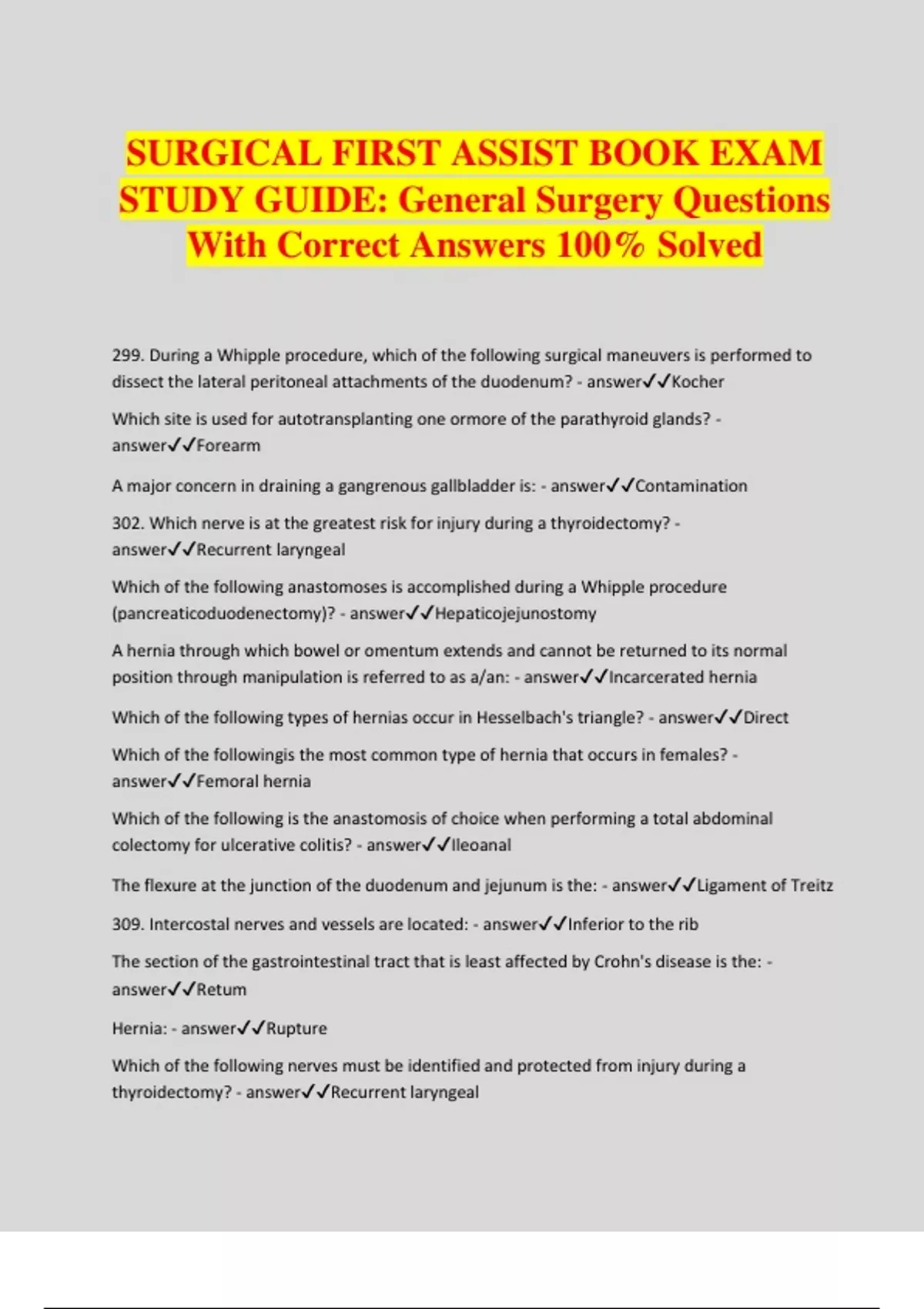 SURGICAL FIRST ASSIST BOOK EXAM STUDY GUIDE: General Surgery Questions With Correct Answers 100% Solved 299. During a Whipple procedure, which of the following surgical maneuvers is performed to dissect the lateral peritoneal attachments of the duodenum? - answerKocher Which site is used for autotransplanting one ormore of the parathyroid glands? - answerForearm A major concern in draining a gangrenous gallbladder is: - answerContamination 302. Which nerve is at the greatest risk for injury during a thyroidectomy? - answerRecurrent laryngeal Which of the following anastomoses is accomplished during a Whipple procedure (pancreaticoduodenectomy)? - answerHepaticojejunostomy A hernia through which bowel or omentum extends and cannot be returned to its normal position through manipulation is referred to as a/an: - answerIncarcerated hernia Which of the following types of hernias occur in Hesselbach's triangle? - answerDirect Which of the followingis the most common type of hernia that occurs in females? - answerFemoral hernia Which of the following is the anastomosis of choice when performing a total abdominal colectomy for ulcerative colitis? - answerIleoanal The flexure at the junction of the duodenum and jejunum is the: - answerLigament of Treitz 309. Intercostal nerves and vessels are located: - answerInferior to the rib The section of the gastrointestinal tract that is least affected by Crohn's disease is the: - answerRetum Hernia: - answerRupture Which of the following nerves must be identified and protected from injury during a thyroidectomy? - answerRecurrent laryngeal