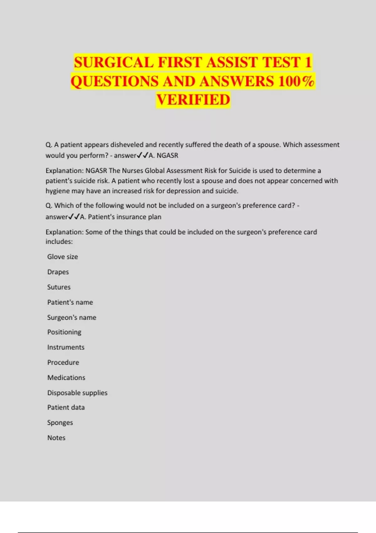 SURGICAL FIRST ASSIST TEST 1 QUESTIONS AND ANSWERS 100% VERIFIED Q. A patient appears disheveled and recently suffered the death of a spouse. Which assessment would you perform? - answerA. NGASR Explanation: NGASR The Nurses Global Assessment Risk for Suicide is used to determine a patient's suicide risk. A patient who recently lost a spouse and does not appear concerned with hygiene may have an increased risk for depression and suicide. Q. Which of the following would not be included on a surgeon's preference card? - answerA. Patient's insurance plan Explanation: Some of the things that could be included on the surgeon's preference card includes: Glove size Drapes Sutures Patient's name Surgeon's name Positioning Instruments Procedure Medications Disposable supplies Patient data Sponges Notes Any special request Prep Q. Erik Erikson described development that occurs throughout the lifespan. In which of Erikson's stages of psychosocial development does a child need to begin asserting control and power over his environment? - answerA. initiative vs. guilt Explanation: In the stage of initiative vs. guilt children need to begin asserting control and power over the environment. Success in this stage leads to a sense of purpose. Children who try to exert too much power experience disapproval, resulting in a sense of guilt. Q. A family unit that consists of two parents and a child is known as which of the following? - answerA. Nuclear family. Explanation: Families consisting of two parents and children are nuclear families. Assessing family structure helps a nurse better understand the support and barriers present for the patient and his or her care. Careful attention to family dynamics and roles not only helps the nurse to better understand the patient, but also plays a role in planning effective care. Q. Debridement is what? - answerA. Removal of necrotic tissue. Explanation: Correct answer: Removal of necrotic tissue Debridement is the process of surgically removing dead or damaged tissue from the patient. It is similar to the term amputate but amputation usually involves cutting off a limb. Q. Agreement by a patient to accept a course of treatment is known as which of the following? - answerA. Informed consent. Explanation: The agreement by a patient to a course of treatment, based on the information provided, is informed consent. Children under 18 cannot provide informed consent, but only assent; a parent's informed consent is needed for most procedures. Be familiar with local laws regarding exceptions, as some minors can seek some care without parental consent. Informed consent must involve a signature. Q. Of the following statements, which would not be correct when setting up for robotic surgery? - answerA. The robotic cart should be placed at the patient's head. Explanation: The robotic cart should not be placed at the patient's head. If the robotic cart is placed at the patient's head, it could interfere with anesthesia activities and be a safety problem Q. Of the following, which would be considered one of the five basic types of MIS (minimally invasive surgery)? - answerA. All of the above Explanation: The five basic types of MIS consists of: single incision laparoscopic surgery, robotic surgery, video assisted thoracoscopic surgery, multiple-incision MIS and natural orifice transluminal endoscopic surgery. Q. What is septicemia - answerA. Presence of pathogens contaminating the blood Explanation: Septicemia means the blood has become septic (contaminated)--a systemic infection. This condition is due to the presence of bacteria or pathogens in the blood. It can start from infections elsewhere such as a respiratory infection or simple infected cut and become worse very quickly. Septicemia is a serious, life-threatening complication following surgery requiring prompt medical care. Q. What is spinal anesthesia used to block - answerA. Somatic sensory nerves and motor fibers Explanation: Spinal anesthesia blocks somatic sensory and motor fibers. It often used for surgery on the legs or in the pelvic r