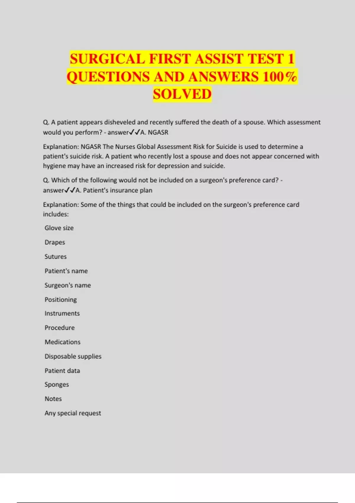 SURGICAL FIRST ASSIST TEST 1 QUESTIONS AND ANSWERS 100% SOLVED Q. A patient appears disheveled and recently suffered the death of a spouse. Which assessment would you perform? - answerA. NGASR Explanation: NGASR The Nurses Global Assessment Risk for Suicide is used to determine a patient's suicide risk. A patient who recently lost a spouse and does not appear concerned with hygiene may have an increased risk for depression and suicide. Q. Which of the following would not be included on a surgeon's preference card? - answerA. Patient's insurance plan Explanation: Some of the things that could be included on the surgeon's preference card includes: Glove size Drapes Sutures Patient's name Surgeon's name Positioning Instruments Procedure Medications Disposable supplies Patient data Sponges Notes Any special request Prep Q. Erik Erikson described development that occurs throughout the lifespan. In which of Erikson's stages of psychosocial development does a child need to begin asserting control and power over his environment? - answerA. initiative vs. guilt Explanation: In the stage of initiative vs. guilt children need to begin asserting control and power over the environment. Success in this stage leads to a sense of purpose. Children who try to exert too much power experience disapproval, resulting in a sense of guilt. Q. A family unit that consists of two parents and a child is known as which of the following? - answerA. Nuclear family. Explanation: Families consisting of two parents and children are nuclear families. Assessing family structure helps a nurse better understand the support and barriers present for the patient and his or her care. Careful attention to family dynamics and roles not only helps the nurse to better understand the patient, but also plays a role in planning effective care. Q. Debridement is what? - answerA. Removal of necrotic tissue. Explanation: Correct answer: Removal of necrotic tissue Debridement is the process of surgically removing dead or damaged tissue from the patient. It is similar to the term amputate but amputation usually involves cutting off a limb. Q. Agreement by a patient to accept a course of treatment is known as which of the following? - answerA. Informed consent. Explanation: The agreement by a patient to a course of treatment, based on the information provided, is informed consent. Children under 18 cannot provide informed consent, but only assent; a parent's informed consent is needed for most procedures. Be familiar with local laws regarding exceptions, as some minors can seek some care without parental consent. Informed consent must involve a signature. Q. Of the following statements, which would not be correct when setting up for robotic surgery? - answerA. The robotic cart should be placed at the patient's head. Explanation: The robotic cart should not be placed at the patient's head. If the robotic cart is placed at the patient's head, it could interfere with anesthesia activities and be a safety problem Q. Of the following, which would be considered one of the five basic types of MIS (minimally invasive surgery)? - answerA. All of the above Explanation: The five basic types of MIS consists of: single incision laparoscopic surgery, robotic surgery, video assisted thoracoscopic surgery, multiple-incision MIS and natural orifice transluminal endoscopic surgery. Q. What is septicemia - answerA. Presence of pathogens contaminating the blood Explanation: Septicemia means the blood has become septic (contaminated)--a systemic infection. This condition is due to the presence of bacteria or pathogens in the blood. It can start from infections elsewhere such as a respiratory infection or simple infected cut and become worse very quickly. Septicemia is a serious, life-threatening complication following surgery requiring prompt medical care. Q. What is spinal anesthesia used to block - answerA. Somatic sensory nerves and motor fibers Explanation: Spinal anesthesia blocks somatic sensory and motor fibers. It often used for surgery on the legs or in the pelvic region. Q. Actions undertaken by an individual to promote health and well being or to detect disease when it is early or asymptomatic are known as which of the following? - answerA. Health behaviors. Explanation: Health behaviors are behaviors undertaken by an individual before illness presents itself. Health behaviors are focused on promoting health and well being, as well as on catching disease in the early stages. Q. Which of these surgical dressings could be used in minor surgeries and for minor wounds to approximate small incisions and protect the wound? - answerA. Steri-Strips Explanation: When applying the Steri-Strips, a small amount of biological adhesive such as benzoin spray can be applied before the strips are put on to help them have extra adhesion. With some incisions, the Steri-Strips can protect the incision line and serves as a dressing. Q. The scrub technician receives a medication from the circulator. It is no longer in its original container, which of the following interventions should the scrub technician do next? - answerA. Label the medication immediately Explanation: Typically, most medications are clear in color and it would be very easy to mix medications up if they are not labeled. Q. What is a disadvantage of using a standardized care planning form in a multidisciplinary setting? - answerA. Reduce individual intervention. Explanation: The need for a nurses individual intervention may diminish with standardized care planning. It may also limit the focus to problems that are predictable. The other answers are pros of standardized care plann