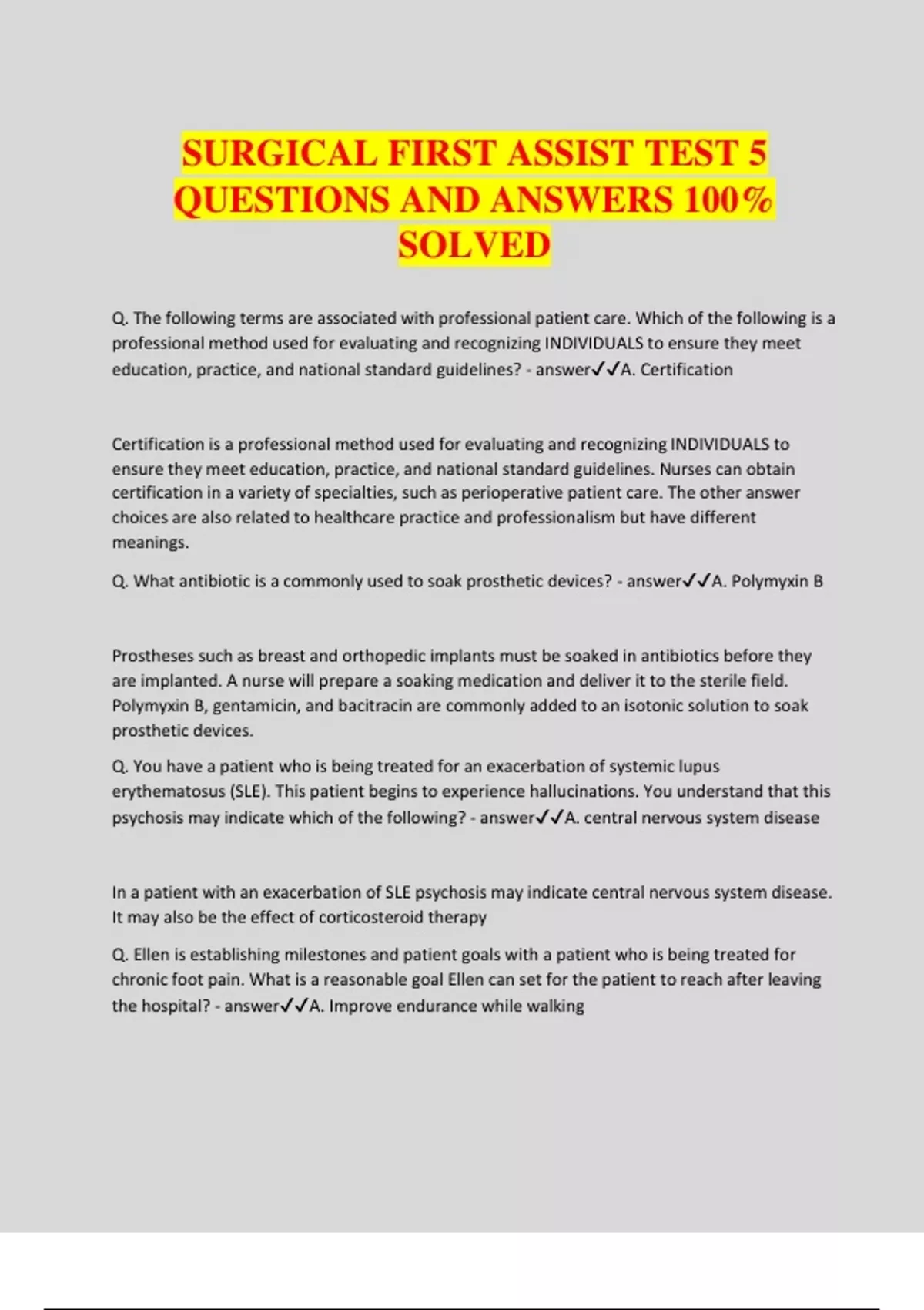 SURGICAL FIRST ASSIST TEST 5 QUESTIONS AND ANSWERS 100% SOLVED Q. The following terms are associated with professional patient care. Which of the following is a professional method used for evaluating and recognizing INDIVIDUALS to ensure they meet education, practice, and national standard guidelines? - answerA. Certification Certification is a professional method used for evaluating and recognizing INDIVIDUALS to ensure they meet education, practice, and national standard guidelines. Nurses can obtain certification in a variety of specialties, such as perioperative patient care. The other answer choices are also related to healthcare practice and professionalism but have different meanings. Q. What antibiotic is a commonly used to soak prosthetic devices? - answerA. Polymyxin B Prostheses such as breast and orthopedic implants must be soaked in antibiotics before they are implanted. A nurse will prepare a soaking medication and deliver it to the sterile field. Polymyxin B, gentamicin, and bacitracin are commonly added to an isotonic solution to soak prosthetic devices. Q. You have a patient who is being treated for an exacerbation of systemic lupus erythematosus (SLE). This patient begins to experience hallucinations. You understand that this psychosis may indicate which of the following? - answerA. central nervous system disease In a patient with an exacerbation of SLE psychosis may indicate central nervous system disease. It may also be the effect of corticosteroid therapy Q. Ellen is establishing milestones and patient goals with a patient who is being treated for chronic foot pain. What is a reasonable goal Ellen can set for the patient to reach after leaving the hospital? - answerA. Improve endurance while walking An attainable goal for a person with foot pain is to build endurance over time. Many nurses may set a designated time or just monitor progress. It would be unreasonable for the nurse to expect the patient eliminate all pain or refrain from daily activities Q. Which of the following pieces of special equipment might be needed during a gastrointestinal surgery? - answerA. Ultrasound scalpel and bowel bag Some of this equipment could include: Ultrasound scalpel Bowel bag-to enclose the bowel during open surgery High-frequency vessel-sealing system Vessel loops for large vessel dissection Ultrasound probe Temporary ostomy bag Q. Choose the diagnosis that belongs under safety and security in Maslow's hierarchy. - answerA. Death anxiety Safety and security include both physical and psychological problems. Death anxiety is a psychological problem that needs to be addressed as the patient's safety and security needs. Q. Which patient is at the most risk for developing a pulmonary complication after an operation? - answerA. Smoker The smoker is at most risk for developing pulmonary complications. Smoking not only affects the respiratory functions, but it also impairs the immune system making the patient more prone to developing an infection. Q. What are common areas for pressure ulcers to form? - answerA. Heels, elbows The most common areas for pressure ulcers to form are bony prominences where the tissue tends to be thin. The heels, elbows, scapula, sacrum, and coccyx are at high risks for forming a pressure ulcer. Q. What information should the patient slip for transport to operative procedures include? - answerA.Patient name, hospital number, location , date, time of departure The patient name must be on any transport documentation to ensure the correct person is taken to the procedure. The pickup slip will also have additional information (such as locations, date and time of transport) as required by the facility Q. Your patient has developed a dependency on you that seems to relate to the fact that he lost his mother recently. These feelings are classified as which of the following? - answerA. transference Transference occurs when the patient transfers feelings from the past to the nurse. Counter- transference takes place when the nurse responds to the patient on a personal level. Q. In terms of ethical theories, the theory which holds that an act's moral rightness is determined by the inherent duty one has to act in accordance with rules and principles is which of the following? - answerA. deontolog