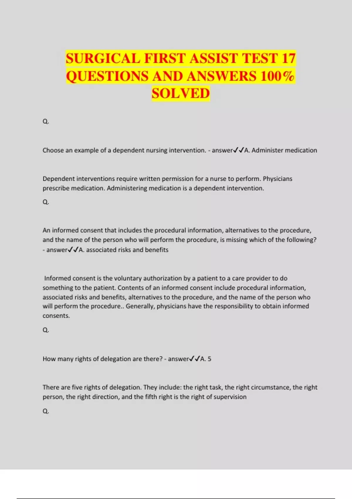 SURGICAL FIRST ASSIST TEST 17 QUESTIONS AND ANSWERS 100% SOLVED Q. Choose an example of a dependent nursing intervention. - answerA. Administer medication Dependent interventions require written permission for a nurse to perform. Physicians prescribe medication. Administering medication is a dependent intervention. Q. An informed consent that includes the procedural information, alternatives to the procedure, and the name of the person who will perform the procedure, is missing which of the following? - answerA. associated risks and benefits Informed consent is the voluntary authorization by a patient to a care provider to do something to the patient. Contents of an informed consent include procedural information, associated risks and benefits, alternatives to the procedure, and the name of the person who will perform the procedure.. Generally, physicians have the responsibility to obtain informed consents. Q. How many rights of delegation are there? - answerA. 5 There are five rights of delegation. They include: the right task, the right circumstance, the right person, the right direction, and the fifth right is the right of supervision Q. The key technique with the objective of bleeding prevention would be which of the following? - answerA Tissue handling Tissue handling involves a key technique in which the surgeon is extremely gentle with tissues to prevent bleeding and minimizing blood loss. This is an especially important technique in areas where a safe and consistent blood supply is in doubt. Q. Of the following terms, which would be considered correct for when the heart beats and the ventricles force the blood out into the aorta sending a wave of increased pressure from the heart out through the arteries? - answerA. Pulse The wave of pressure from the heart beating is called the pulse. The pulse can be felt in any of the arteries that are close to the surface of the body. Q. How should a retractor be passed to the surgeon? - answerA. With the tip down toward the wound Handheld retractors are passed with the tip toward the wound. If a self-retaining retractor is being used, then it is passed in a fully closed position ready for positioning in the wound. Q. Duties of the registered nurse assistants to the surgeon include all of the following EXCEPT for: - answerA. Make incisions The surgeon makes incisions NOT the registered nurse assistant. The registered nurse surgical assistant primarily handles tissues and instruments. Duties include helping to maintain visibility of the site, closing wounds, and controlling bleeding. Q. A patient is being moved from post-op back to his room. Which of the following team members typically will accompany the transporter and patient to the patient's room? - answerA. Unit nurse A member of the nursing unit typically accompanies the transporter to the patient's room. The unit nurse will confirm the identity of the patient. The unit nurse may also assist with transferring the patient to the bed. Q. Leaving a patient unattended is known as which of the following? - answerA. Abandonment Leaving a patient unattended is known as abandonment. If you must leave a patient, it is key to let him or her know that you will return shortly or ensure that someone else is with the patient. Q. The nursing diagnosis deals with which of the following? - answerA. human response to heath problems A medical diagnosis deals with disease or medical condition. A nursing diagnosis deals with human response to actual or potential health problems and life processes. Q. Movement of the muscles drawing away from the center of the body is called? - answerA. Abduction Abduction refers to the muscle movement of drawing away from the center of the body. Some examples of abduction could include: spreading fingers apart or extending arms or legs. Q. Which of the types of forceps are most commonly used for delicate tissues such as serosa, ducts, bowel, and blood vessels? - answerA. Smooth forceps The smooth forceps which are commonly used on delicate tissues have no teeth. Some of the common smooth forceps would be smooth Cushing forceps and smooth Adson forceps. Q. Which of the following is the term for the process that allows nurses to enrich their clinical training and experience through the utilization of up to date research? - answerA. evidence- based practice Evidence based practice allows nurses to enrich their clinical training and experience through the utilization of up to date research. With the large amount of research and information that exists in the health care arena, learning the skills of evidence based practice allows nurses to search for, assess, and apply the literature to their clinical situations. Q. How many times should you repeat a percussion technique when examining patients? - answerA. Three tim