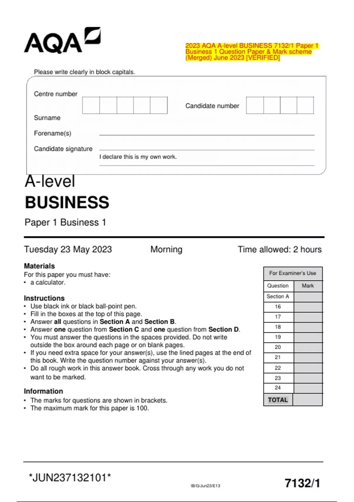 Biology A H420/01: Biological processes A Level Question Paper & Mark Scheme (Merged)
