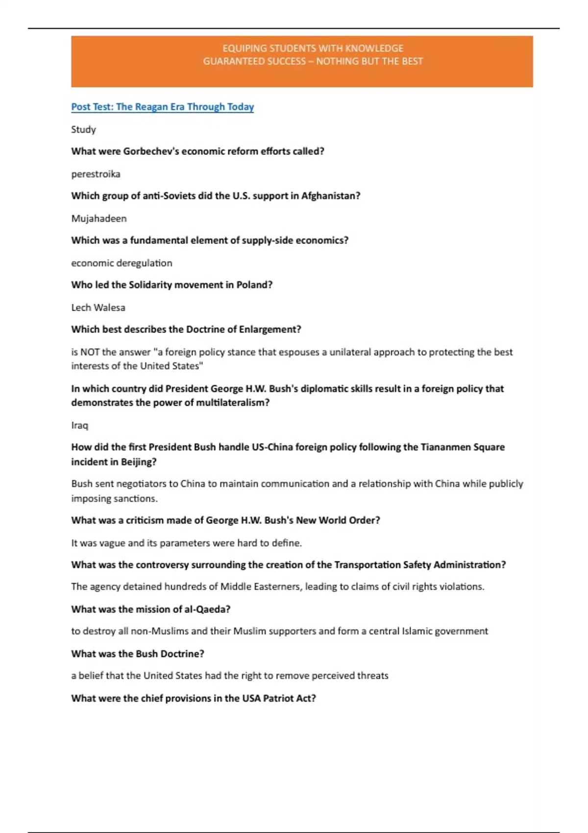 What were Gorbechev's economic reform efforts called? perestroika Which group of anti-Soviets did the U.S. support in Afghanistan? Mujahadeen Which was a fundamental element of supply-side economics? economic deregulation Who led the Solidarity movement in Poland? Lech Walesa Which best describes the Doctrine of Enlargement? is NOT the answer "a foreign policy stance that espouses a unilateral approach to protecting the best interests of the United States" In which country did President George H.W. Bush's diplomatic skills result in a foreign policy that demonstrates the power of multilateralism? Iraq How did the first President Bush handle US-China foreign policy following the Tiananmen Square incident in Beijing? Bush sent negotiators to China to maintain communication and a relationship with China while publicly imposing sanctions. What was a criticism made of George H.W. Bush's New World Order? It was vague and its parameters were hard to define. What was the controversy surrounding the creation of the Transportation Safety Administration? The agency detained hundreds of Middle Easterners, leading to claims of civil rights violations. What was the mission of al-Qaeda? to destroy all non-Muslims and their Muslim supporters and form a central Islamic government What was the Bush Doctrine? a belief that the United States had the right to remove perceived threats What were the chief provisions in the USA Patriot Act