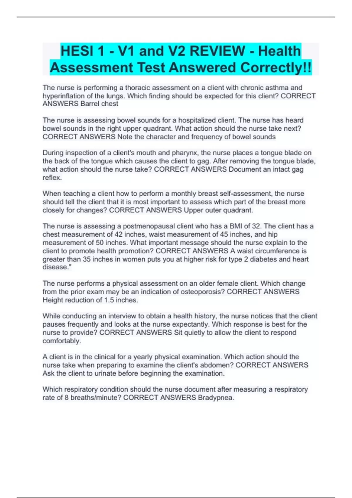 HESI 1 - V1 and V2 REVIEW - Health Assessment Test Answered Correctly!!