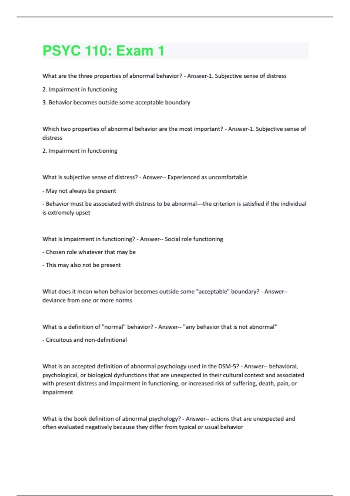What are the three properties of abnormal behavior? - Answer-1. Subjective sense of distress 2. Impairment in functioning 3. Behavior becomes outside some acceptable boundary Which two properties of abnormal behavior are the most important? - Answer-1. Subjective sense of distress 2. Impairment in functioning What is subjective sense of distress? - Answer-- Experienced as uncomfortable - May not always be present - Behavior must be associated with distress to be abnormal---the criterion is satisfied if the individual is extremely upset What is impairment in functioning? - Answer-- Social role functioning - Chosen role whatever that may be - This may also not be present What does it mean when behavior becomes outside some "acceptable" boundary? - Answer-- deviance from one or more norms What is a definition of "normal" behavior? - Answer-- "any behavior that is not abnormal" - Circuitous and non-definitional What is an accepted definition of abnormal psychology used in the DSM-5? - Answer-- behavioral, psychological, or biological dysfunctions that are unexpected in their cultural context and associated with present distress and impairment in functioning, or increased risk of suffering, death, pain, or impairment What is the book definition of abnormal psychology? - Answer-- actions that are unexpected and often evaluated negatively because they differ from typical or usual behavior"The greater the deviation, the more abnormal it is" True or False? When considering cultural differences, it's best to refer to the idea that behavior is abnormal if you're violating social norms - Answer-True What are some problems/arguments with the definition of abnormal behavior? - Answer-- The definition DEPENDS/varies on quality, quantity, and continuity - Some argue "we can never satisfactorily define disease or disorder" - suffering and distress is sometimes absent---can't use these as defining terms What is normal behavior being researched more in terms of? - Answer-- positive psychology - mental well-being - psychological health Abnormal behavior is ________ defined - Answer-culturally What is Zeitgeist? - Answer-- current cultural climate - "spirit of the times" - implies nothing is static regarding definitions of abnormal behavior Why does Zeitgeist matter? - Answer-cultural climate is critical in defining normal vs. abnormal What are some examples of Zeitgeist and Culture? - Answer-- Drapetomania: uncontrollable tendency of black slaves to flee captivity - Homosexuality: mental disorder in DSM up to DSM-3 (disorder of sexual deviancy) What are the differences between the continuity (quality) and discontinuity (quantity) models? - Answer-- Abnormal behavior separate from normal by some measurable amount *(quantity)* - Abnormal behavior deviates to some degree from a population mean *(quality)*What is a quantity model example? - Answer-Beck Depression Inventory Scores (BDI) What does the Beck Depression Inventory Scores indicate? - Answer-- Cutoff scores say when patient is depressed - Score above 19 suggests clinical depression - Score at or over 30 suggest severe depression *can have population mean