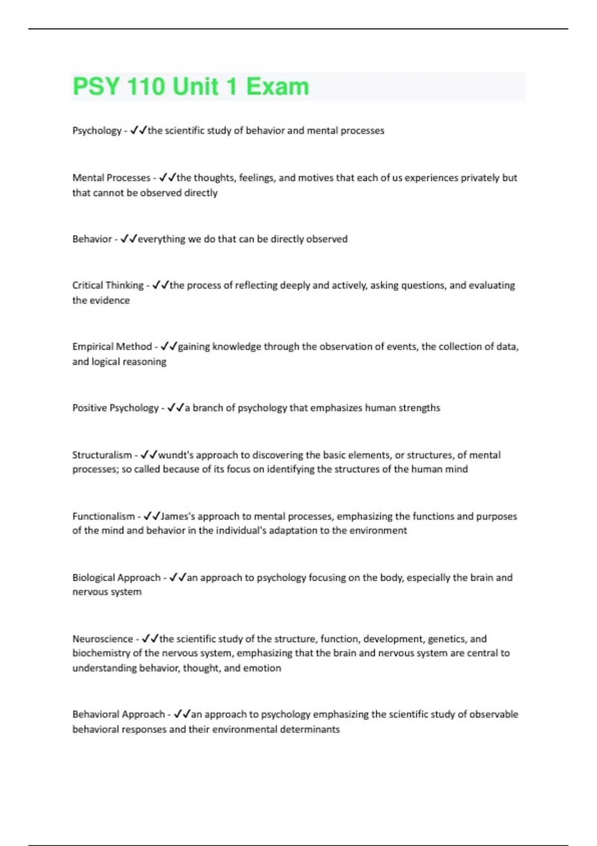 Psychology - the scientific study of behavior and mental processes Mental Processes - the thoughts, feelings, and motives that each of us experiences privately but that cannot be observed directly Behavior - everything we do that can be directly observed Critical Thinking - the process of reflecting deeply and actively, asking questions, and evaluating the evidence Empirical Method - gaining knowledge through the observation of events, the collection of data, and logical reasoning Positive Psychology - a branch of psychology that emphasizes human strengths Structuralism - wundt's approach to discovering the basic elements, or structures, of mental processes; so called because of its focus on identifying the structures of the human mind Functionalism - James's approach to mental processes, emphasizing the functions and purposes of the mind and behavior in the individual's adaptation to the environment Biological Approach - an approach to psychology focusing on the body, especially the brain and nervous system Neuroscience - the scientific study of the structure, function, development, genetics, and biochemistry of the nervous system, emphasizing that the brain and nervous system are central to understanding behavior, thought, and emotion Behavioral Approach - an approach to psychology emphasizing the scientific study of observable behavioral responses and their environmental determinantsPsychodynamic Approach - an approach to psychology emphasizing unconscious thought, the conflict between biological drives (such as the drive for sex) and society's demands, and early childhood family experiences Humanistic Approach - an approach to psychology emphasizing a person's positive qualities, the capacity for positive growth, and the freedom to choose any destiny Cognitive Approach - an approach to psychology emphasizing the mental processes involved in knowing: how we direct our attention, perceive, remember, think, and solve problems Evolutionary Approach - an approach to psychology centered on evolutionary ideas such as adaptation, reproduction, and natural selection as the basis for explaining specific human behaviors Sociocultural Approach - an approach to psychology that examines the ways in which social and cultural environments influence behavior Physiological Psychology - interested in the physical processes that underlie mental operations such as vision and memory. Sensation and Perception Psychology - focus on the physical systems and psychological processes that allow us to experience the world Learning Psychology - intricate process by which behavior changes in response to changing circumstances Cognitive Psychology - is the broad name given to the field of psychology that examines attention, consciousness, information processing, and memory.