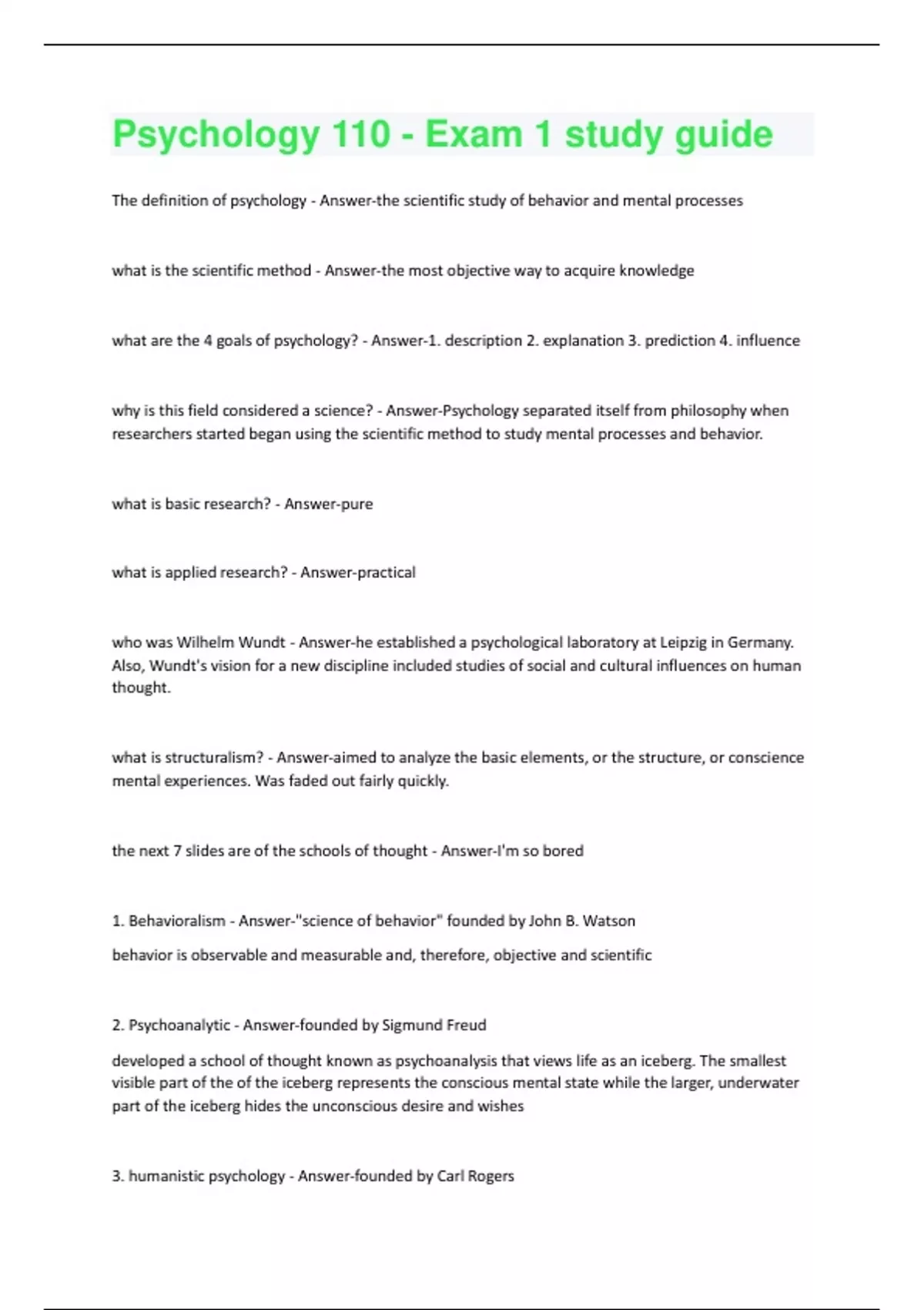 The definition of psychology - Answer-the scientific study of behavior and mental processes what is the scientific method - Answer-the most objective way to acquire knowledge what are the 4 goals of psychology? - Answer-1. description 2. explanation 3. prediction 4. influence why is this field considered a science? - Answer-Psychology separated itself from philosophy when researchers started began using the scientific method to study mental processes and behavior. what is basic research? - Answer-pure what is applied research? - Answer-practical who was Wilhelm Wundt - Answer-he established a psychological laboratory at Leipzig in Germany. Also, Wundt's vision for a new discipline included studies of social and cultural influences on human thought. what is structuralism? - Answer-aimed to analyze the basic elements, or the structure, or conscience mental experiences. Was faded out fairly quickly. the next 7 slides are of the schools of thought - Answer-I'm so bored 1. Behavioralism - Answer-"science of behavior" founded by John B. Watson behavior is observable and measurable and, therefore, objective and scientific 2. Psychoanalytic - Answer-founded by Sigmund Freud developed a school of thought known as psychoanalysis that views life as an iceberg. The smallest visible part of the of the iceberg represents the conscious mental state while the larger, underwater part of the iceberg hides the unconscious desire and wishes 3. humanistic psychology - Answer-founded by Carl Rogersfocuses on human uniqueness and their capacity for growth, choice, and psychological health 4. Cognitive psychology - Answer-sees humans as active participants who seek out experiences, who alter and shape those experiences, and who use mental processes to transform information in the course of their own cognitive development 5. Executive Psychology - Answer-focuses on how the human behaviors required for survival have adapted in the face of environmental pressures over the long course of evolution 6. Biological Psychologist - Answer-They study the structures of the brain and central nervous system, the functioning of neurons, the delicate balance of neurotransmitters and hormones, and the effects of heredity to look for links between these biological factors and behavior 7. the Sociocultural approach - Answer-The sociocultural approach emphasizes social and cultural influences on human behavior and stresses the importance of understanding those influences when interpreting the behavior of others the next 7 slides are the perspectives and emphasis of each thought of psychology - Answer-help 1. Behavior - Answer-the role of environment in shaping and controlling behavior 2. psychoanalytic - Answer-The role of unconscious motivation and early childhood experiences in determining behavior and thought 3. Humanistic - Answer-The importance of an individual's subjective experience as a key to understanding his or her behavior 4. Cognitive - Answer-The role of mental processes—perception, thinking, and memory—that underlie behavior 5. Biological - Answer-The role of biological processes and structures, as well as heredity, in explaining behavi