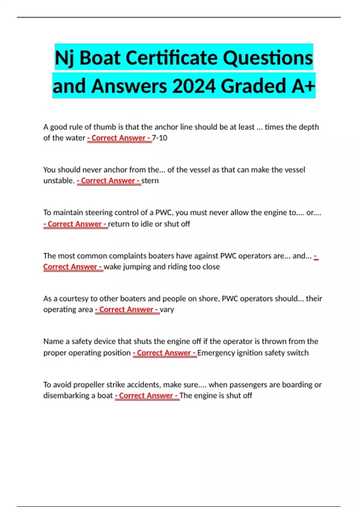 Nj Boat Certificate Questions and Answers 2024 Graded A+ Nj Boat Certificate Questions and Answers 2024 Graded A+ Nj Boat Certificate Questions and Answers 2024 Graded A+