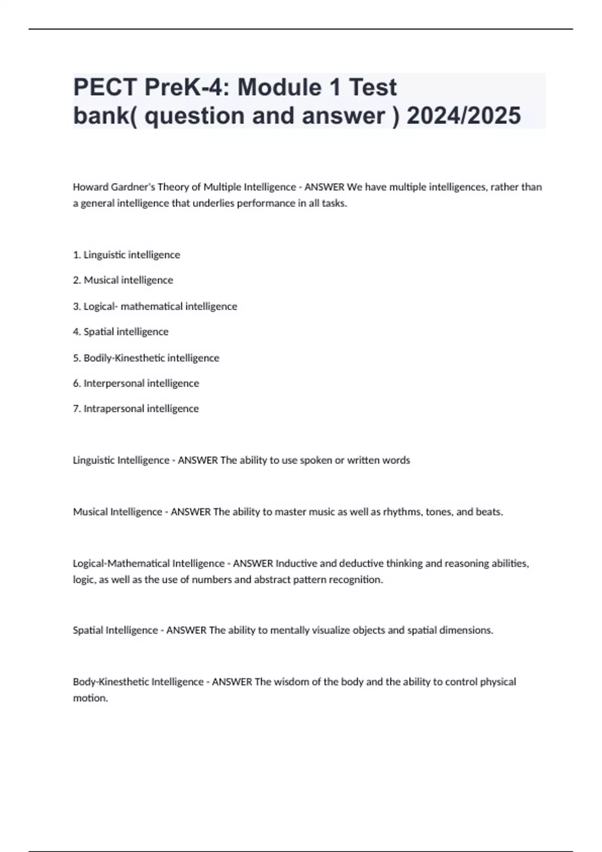 PECT PreK-4: Module 1 Test bank( question and answer ) 2024/2025 Howard Gardner's Theory of Multiple Intelligence We have multiple intelligences, rather than a general intelligence that underlies performance in all tasks. 1. Linguistic intelligence 2. Musical intelligence 3. Logical- mathematical intelligence 4. Spatial intelligence 5. Bodily-Kinesthetic intelligence 6. Interpersonal intelligence 7. Intrapersonal intelligence Linguistic Intelligence The ability to use spoken or written words