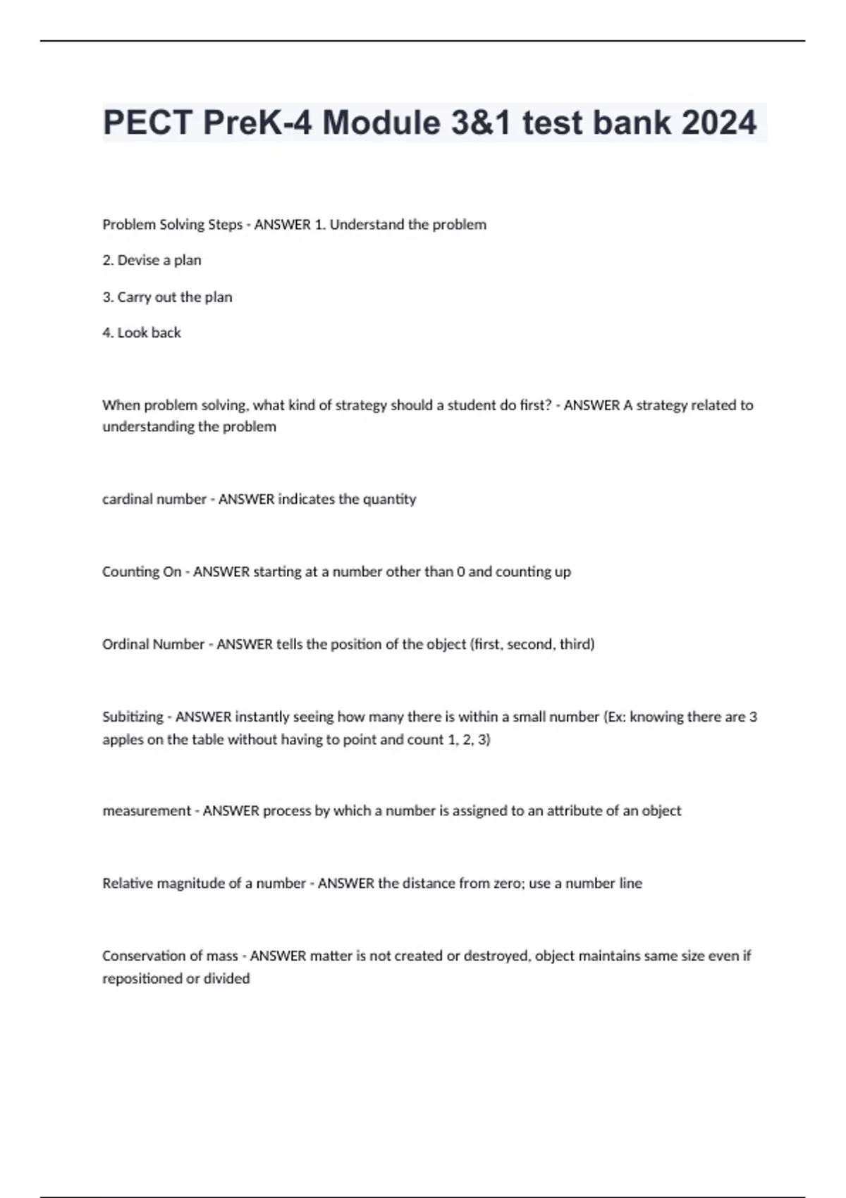 PECT PreK-4 Module 3&1 test bank 2024 cardinal number indicates the quantity Counting On starting at a number other than 0 and counting up Ordinal Number tells the position of the object (first, second, third) Subitizing instantly seeing how many there is within a small number (Ex: knowing there are 3 apples on the table without having to point and count 1, 2, 3)