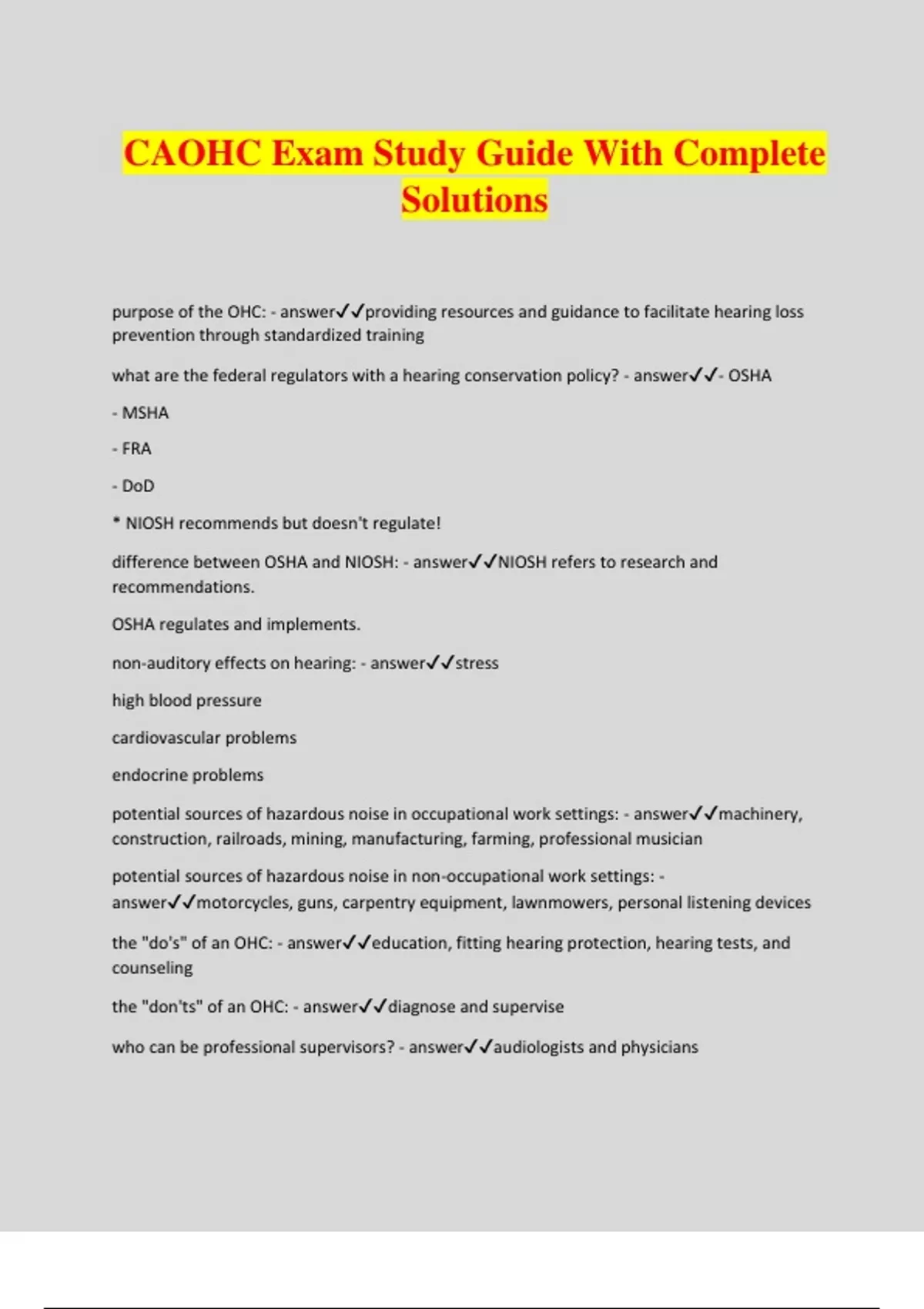 CAOHC Exam Study Guide With Complete Solutions purpose of the OHC: - answerproviding resources and guidance to facilitate hearing loss prevention through standardized training what are the federal regulators with a hearing conservation policy? - answer- OSHA - MSHA - FRA - DoD * NIOSH recommends but doesn't regulate! difference between OSHA and NIOSH: - answerNIOSH refers to research and recommendations. OSHA regulates and implements. non-auditory effects on hearing: - answerstress high blood pressure cardiovascular problems endocrine problems potential sources of hazardous noise in occupational work settings: - answermachinery, construction, railroads, mining, manufacturing, farming, professional musician potential sources of hazardous noise in non-occupational work settings: - answermotorcycles, guns, carpentry equipment, lawnmowers, personal listening devices the "do's" of an OHC: - answereducation, fitting hearing protection, hearing tests, and counseling the "don'ts" of an OHC: - answerdiagnose and supervise who can be professional supervisors? - answeraudiologists and physicians which occupational population is most at risk for NIHL and has the highest amount of claims? - answermanufacturing accounts for 14% of the U.S. workforce but accounts for 80% of NIHL incidence early state indication of NIHL is identified at which frequencies? - answer3K, 4K, and 6kHz general configuration of conductive hearing loss: - answerflat and often worse at low frequencies what would be an indication of an advanced stage of NIHL? - answernotch configuration progressing to a high-frequency slope symptoms of SNHL: - answerdifficulty discriminating speech or tinnitus symptoms of CHL: - answerfullness, pressure, or muffled hearing peripheral functions are associated with the: - answercochlea what is the audible frequency range at birth? - answer20-20,000 Hz what dB level is action level and what does it require? - answer85 dB requires implementation of a hearing conservation program and inclusion in the program 1.________ is referred to as the low threshold level and is used to determine if inclusion in an HCP is warranted 2.________ is referred to as the high threshold level and is used to determine compliance with the permissible exposure level - answer1. TL = 80 dBA 2. TL = 90 dBA what dB level is the permissible exposure level? - answer90 dB 1.________ is 100% dose 2.________ is 50% dose - answer1. 90 dBA (PEL) for 8 hours 2. 85 dBA (AL) for 8 hours *OSHA* what is the PEL range and AL range/criterion? - answer- PEL: 90-140 dB - AL: 80-130 dB range, 85-130 dB criterion what is the average level? - answerthe level if presented continuously would generate the same amount of energy as the varying levels in the environment level average (Lavg): - answerthe average sound level over a sample of time level equivalent (Leq): - answerthe average sound level measured over the run time but is calculated with a 3 dB exchange rate what does noise dose mean? - answer- represented as a percentage - the allowable daily exposure va