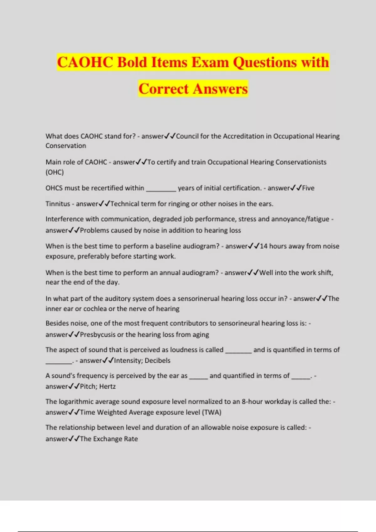 CAOHC Bold Items Exam Questions with Correct Answers What does CAOHC stand for? - answerCouncil for the Accreditation in Occupational Hearing Conservation Main role of CAOHC - answerTo certify and train Occupational Hearing Conservationists (OHC) OHCS must be recertified within ________ years of initial certification. - answerFive Tinnitus - answerTechnical term for ringing or other noises in the ears. Interference with communication, degraded job performance, stress and annoyance/fatigue - answerProblems caused by noise in addition to hearing loss When is the best time to perform a baseline audiogram? - answer14 hours away from noise exposure, preferably before starting work. When is the best time to perform an annual audiogram? - answerWell into the work shift, near the end of the day. In what part of the auditory system does a sensorinerual hearing loss occur in? - answerThe inner ear or cochlea or the nerve of hearing Besides noise, one of the most frequent contributors to sensorineural hearing loss is: - answerPresbycusis or the hearing loss from aging The aspect of sound that is perceived as loudness is called _______ and is quantified in terms of _______. - answerIntensity; Decibels A sound's frequency is perceived by the ear as _____ and quantified in terms of _____. - answerPitch; Hertz The logarithmic average sound exposure level normalized to an 8-hour workday is called the: - answerTime Weighted Average exposure level (TWA) The relationship between level and duration of an allowable noise exposure is called: - answerThe Exchange Rate