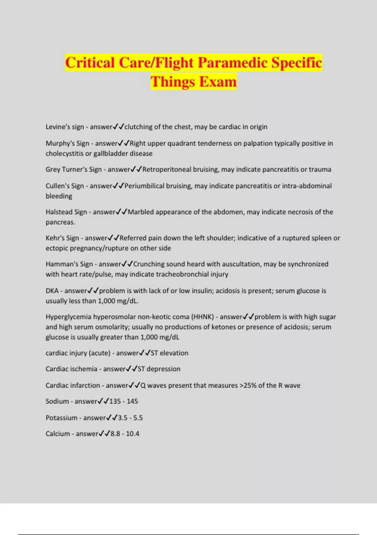 Critical Care/Flight Paramedic Specific Things Exam Levine's sign - answerclutching of the chest, may be cardiac in origin Murphy's Sign - answerRight upper quadrant tenderness on palpation typically positive in cholecystitis or gallbladder disease Grey Turner's Sign - answerRetroperitoneal bruising, may indicate pancreatitis or trauma Cullen's Sign - answerPeriumbilical bruising, may indicate pancreatitis or intra-abdominal bleeding Halstead Sign - answerMarbled appearance of the abdomen, may indicate necrosis of the pancreas. Kehr's Sign - answerReferred pain down the left shoulder; indicative of a ruptured spleen or ectopic pregnancy/rupture on other side Hamman's Sign - answerCrunching sound heard with auscultation, may be synchronized with heart rate/pulse, may indicate tracheobronchial injury DKA - answerproblem is with lack of or low insulin; acidosis is present; serum glucose is usually less than 1,000 mg/dL. Hyperglycemia hyperosmolar non-keotic coma (HHNK) - answerproblem is with high sugar and high serum osmolarity; usually no productions of ketones or presence of acidosis; serum glucose is usually greater than 1,000 mg/dL cardiac injury (acute) - answerST elevation Cardiac ischemia - answerST depression Cardiac infarction - answerQ waves present that measures >25% of the R wave Sodium - answer135 - 145 Potassium - answer3.5 - 5.5 Calcium - answer8.8 - 10.4 Chvostek's sign - answerspasm of the facial muscles produced by sharply tapping over the facial nerve in front of the parotid gland and anterior to the ear; suggestive of hypocalcemia Trouseau's sign - answercarpal spams ind