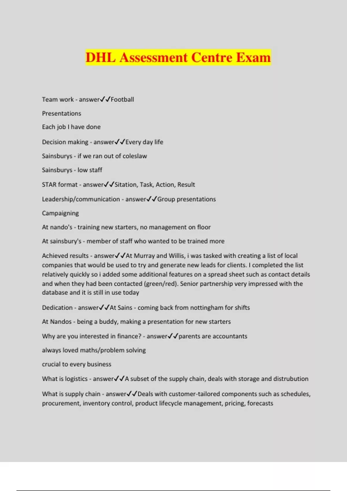 DHL Assessment Centre Exam Team work - answerFootball Presentations Each job I have done Decision making - answerEvery day life Sainsburys - if we ran out of coleslaw Sainsburys - low staff STAR format - answerSitation, Task, Action, Result Leadership/communication - answerGroup presentations Campaigning At nando's - training new starters, no management on floor At sainsbury's - member of staff who wanted to be trained more Achieved results - answerAt Murray and Willis, i was tasked with creating a list of local companies that would be used to try and generate new leads for clients. I completed the list relatively quickly so i added some additional features on a spread sheet such as contact details and when they had been contacted (green/red). Senior partnership very impressed with the database and it is still in use today Dedication - answerAt Sains - coming back from nottingham for shifts At Nandos - being a buddy, making a presentation for new starters Why are you interested in finance? - answerparents are accountants always loved maths/problem solving crucial to every business What is logistics - answerA subset of the supply chain, deals with storage and distrubution What is supply chain - answerDeals with customer-tailored components such as schedules, procurement, inventory control, product lifecycle management, pricing, forecasts