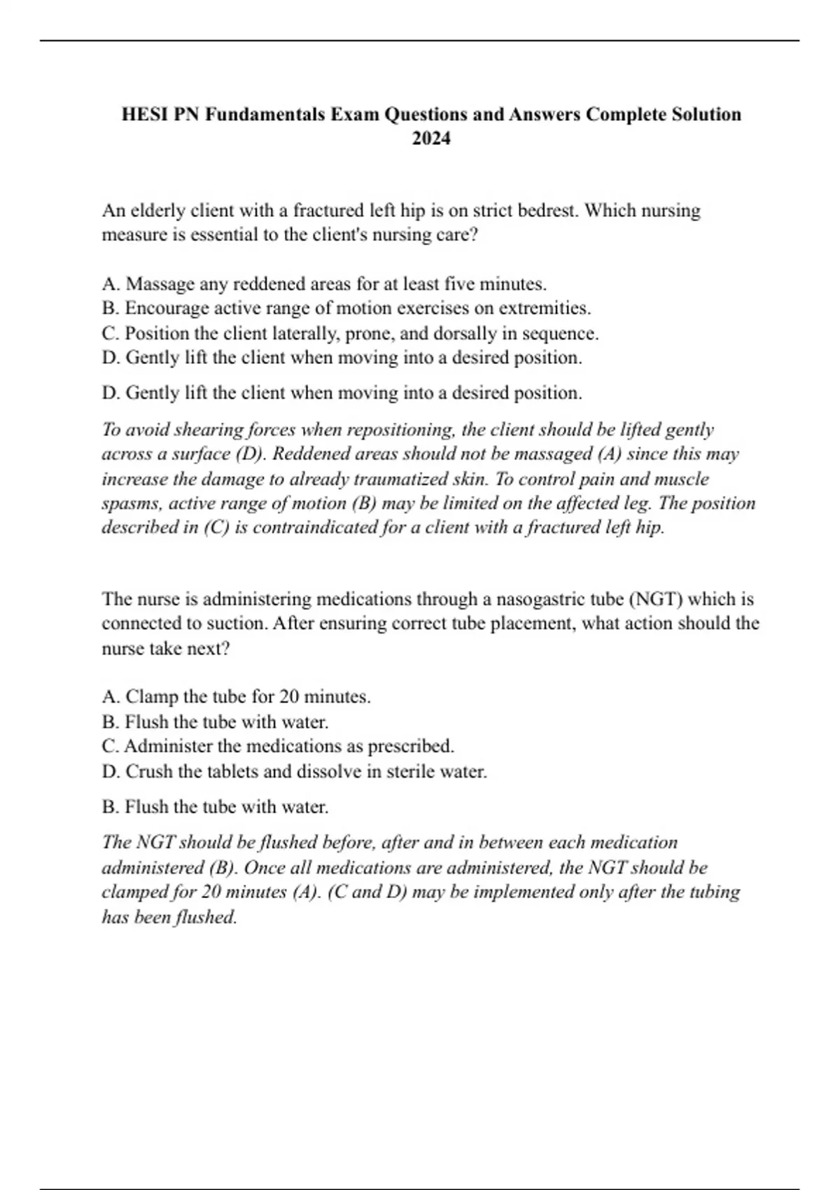 An elderly client with a fractured left hip is on strict bedrest. Which nursing measure is essential to the client's nursing care? A. Massage any reddened areas for at least five minutes. B. Encourage active range of motion exercises on extremities. C. Position the client laterally, prone, and dorsally in sequence. D. Gently lift the client when moving into a desired position. D. Gently lift the client when moving into a desired position. To avoid shearing forces when repositioning, the client should be lifted gently across a surface (D). Reddened areas should not be massaged (A) since this may increase the damage to already traumatized skin. To control pain and muscle spasms, active range of motion (B) may be limited on the affected leg. The position described in (C) is contraindicated for a client with a fractured left hip. The nurse is administering medications through a nasogastric tube (NGT) which is connected to suction. After ensuring correct tube placement, what action should the nurse take next? A. Clamp the tube for 20 minutes. B. Flush the tube with water. C. Administer the medications as prescribed. D. Crush the tablets and dissolve in sterile water. B. Flush the tube with water. The NGT should be flushed before, after and in between each medication administered (B). Once all medications are administered, the NGT should be clamped for 20 minutes (A). (C and D) may be implemented only after the tubing has been flushed.A client who is in hospice care complains of increasing amounts of pain. The healthcare provider prescribes an analgesic every four hours as needed. Which action should the nurse implement? A. Give an around-the-clock schedule for administration of analgesics. B. Administer analgesic medication as needed when the pain is severe. C. Provide medication to keep the client sedated and unaware of stimuli. D. Offer a medication-free period so that the client can do daily activities. A. Give an around-the-clock schedule for administration of analgesics. The most effective management of pain is achieved using an around-the-clock schedule that provides analgesic medications on a regular basis (A) and in a timely manner. Analgesics are less effective if pain persists until it is severe, so an analgesic medication should be administered before the client's pain peaks (B). Providing comfort is a priority for the client who is dying, but sedation that impairs the client's ability to interact and experience the time before life ends should be minimized (C). Offering a medication-free period allows the serum drug level to fall, which is not an effective method to manage chronic pain (D). When assessing a client with wrist restraints, the nurse observes that the fingers on the right hand are blue. What action should the nurse implement first? A. Loosen the right wrist restraint. B. Apply a pulse oximeter to the right hand. C. Compare hand color bilaterally. D. Palpate the right radial pulse. A. Loosen the right wrist restraint. The priority nursing action is to restore circulation by loosening the restraint (A), because blue fingers (cyanosis) indicates decreased circulation. (C and D) are also important nursing interventions, but do not have the priority of (A). Pulse oximetry (B) measures the saturation of hemoglobin with oxygen and is not indicated in situations where the cyanosis is related to mechanical compression (the restraints).The nurse is assessing the nutritional status of several clients. Which client has the greatest nutritional need for additional intake of protein? A. A college-age track runner with a sprained ankle. B. A lactating woman nursing her 3-day-old infant. C. A school-aged child with Type 2 diabetes. D. An elderly man being treated for a peptic ulcer. B. A lactating woman nursing her 3-day-old infant. A lactating woman (B) has the greatest need for additional protein intake. (A, C, and D) are all conditions that require protein, but do not have the increased metabolic protein demands of lactation. A client is in the radiology department at 0900 when the prescription levofloxacin (Levaquin) 500 mg IV q24h is scheduled to be administered. The client returns to the unit at 1300. What is the best intervention for the nurse to implement? A. Contact the healthcare provider and complete a medication variance form. B. Administer the Levaquin at 1300 and resume the 0900 schedule in the morning. C. Notify the charge nurse and complete an incident report to explain the missed dose. D. Give the missed dose at 1300 and change the schedule to administer daily at 1300. D. Give the missed dose at 1300 and change the schedule to administer daily at 1300. To ensure that a therapeutic level of medication is maintained, the nurse should administer the missed dose as soon as possible, and revise the administration schedule accordingly to prevent dangerously increasing the level of the medication in the bloodstream (D). The nurse should document the reason for the late dose, but (A and C) are not warranted. (B) could result in increased blood levels of the drug. While instructing a male client's wife in the performance of passive range-ofmotion exercises to his contracted shoulder, the nurse observes that she is holdinghis arm above and below the elbow. What nursing action should the nurse implement? A. Acknowledge that she is supporting the arm correctly. B. Encourage her to keep the joint covered to maintain warmth. C. Reinforce the need to grip directly under the joint for better support. D. Instruct her to grip directly over the joint for better motion. A. Acknowledge that she is supporting the arm correctly. The wife is performing the passive ROM correctly, therefore the nurse should acknowledge this fact (A). The joint that is being exercised should be uncovered (B) while the rest of the body should remain covered for warmth and privacy. (C and D) do not provide adequate support to the joint while still allowing for joint movement.