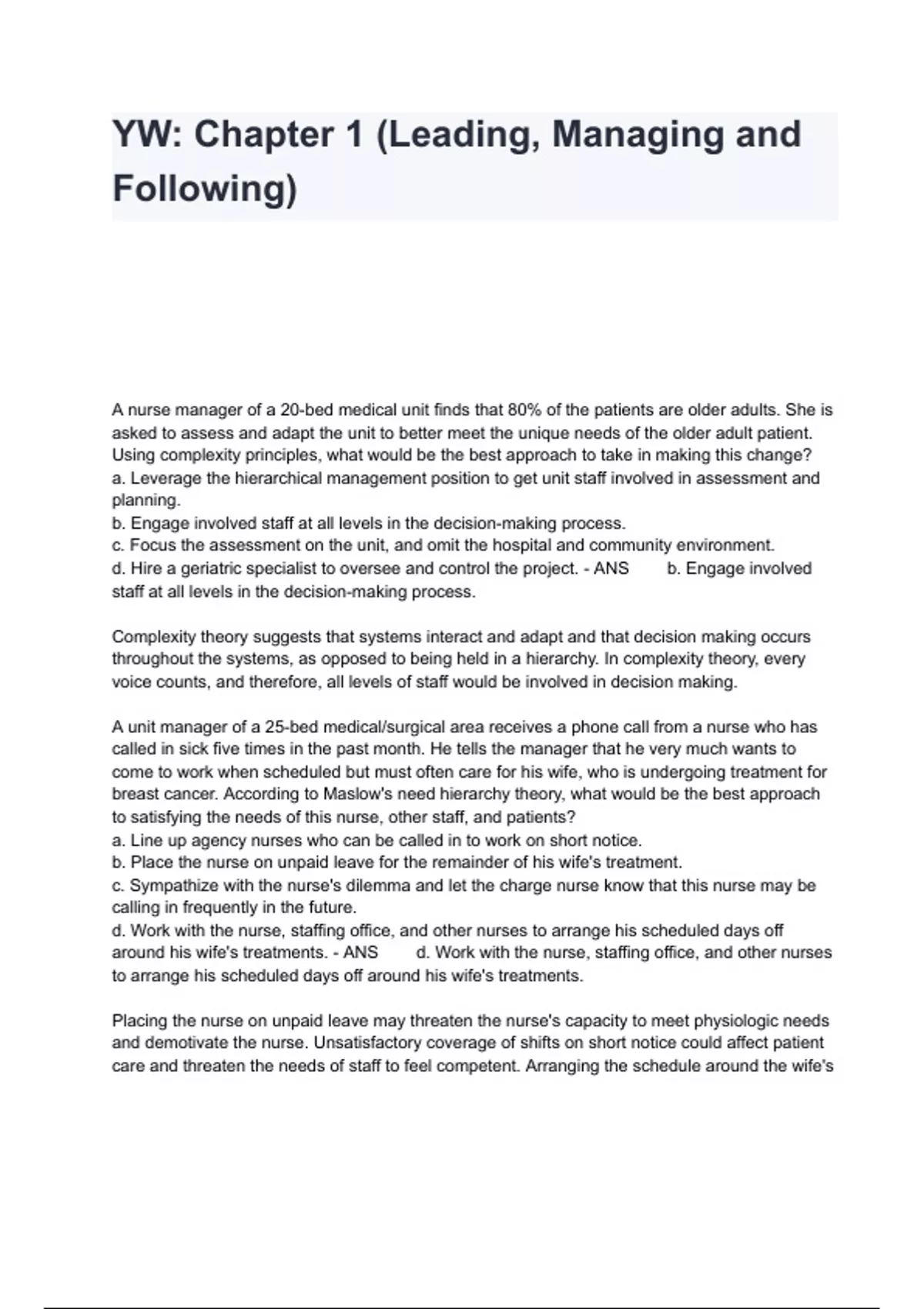 YW: Chapter 1 (Leading, Managing and Following) A nurse manager of a 20-bed medical unit finds that 80% of the patients are older adults. She is asked to assess and adapt the unit to better meet the unique needs of the older adult patient. Using complexity principles, what would be the best approach to take in making this change? a. Leverage the hierarchical management position to get unit staff involved in assessment and planning. b. Engage involved staff at all levels in the decision-making process. c. Focus the assessment on the unit, and omit the hospital and community environment. d. Hire a geriatric specialist to oversee and control the project. - ANS b. Engage involved staff at all levels in the decision-making process. Complexity theory suggests that systems interact and adapt and that decision making occurs throughout the systems, as opposed to being held in a hierarchy. In complexity theory, every voice counts, and therefore, all levels of staff would be involved in decision making. A unit manager of a 25-bed medical/surgical area receives a phone call from a nurse who has called in sick five times in the past month. He tells the manager that he very much wants to come to work when scheduled but must often care for his wife, who is undergoing treatment for breast cancer. According to Maslow's need hierarchy theory, what would be the best approach to satisfying the needs of this nurse, other staff, and patients? a. Line up agency nurses who can be called in to work on short notice. b. Place the nurse on unpaid leave for the remainder of his wife's treatment. c. Sympathize with the nurse's dilemma and let the charge nurse know that this nurse may be calling in frequently in the future. d. Work with the nurse, staffing office, and other nurses to arrange his scheduled days off around his wife's treatments. - ANS d. Work with the nurse, staffing office, and other nurses to arrange his scheduled days off around his wife's treatments. Placing the nurse on unpaid leave may threaten the nurse's capacity to meet physiologic needs and demotivate the nurse. Unsatisfactory coverage of shifts on short notice could affect patient care and threaten the needs of staff to feel competent. Arranging the schedule around the wife's needs meets the needs of the staff and of patients while satisfying the nurse's need for affiliation. A grievance brought by a staff nurse against the unit manager requires mediation. At the first mediation session, the staff nurse repeatedly calls the unit manager's actions unfair, and the unit manager continues to reiterate the reasons for her actions. What would be the best course of action at this time? a. Send the two disputants away to reach their own resolution. b. Involve another staff nurse in the discussion so as to clarify issues. c. Ask each party to examine her own motives and issues in the conflict. d. Continue to listen as the parties repeat their thoughts and feelings about the conflict. - ANS c. Ask each party to examine her own motives and issues in the conflict. Ury, Brett, and Goldberg outline steps to restoring unity, the first of which is to address the interests and involvement of participants in the conflict by examining the real issues of all parties. At a second negotiation session, the unit manager and staff nurse are unable to reach a resolution. It would now be best to: a. Arrange another meeting in a week's time so as to allow a cooling-off period. b. Turn the dispute over to the director of nursing. c. Insist that participants continue to talk until a resolution has been reached. d. Back the unit manager's actions and end the dispute. - ANS a. Arrange another meeting in a week's time so as to allow a cooling-off period. According to the principles outlined by Ury, Brett, and Goldberg, a "cooling-off" period is recommended if resolution fails. The manager of a surgical area has a vision for the future that requires the addition of RN assistants or unlicensed persons to feed, bathe, and walk patients. The RNs on the staff have always practiced in a primary nursing-delivery system and are very resistant to this idea. The best initial strategy in this situation would include: a. Exploring the values of the RN group in relation to this change. b. Leaving the RNs alone for a time so they can think about the change before they are approached again. c. Dropping the idea and trying for the change in another year or so. d. Hiring the assistants and allowing the RNs to see what good additions they are. - ANS a. Exploring the values of the RN group in relation to this change.