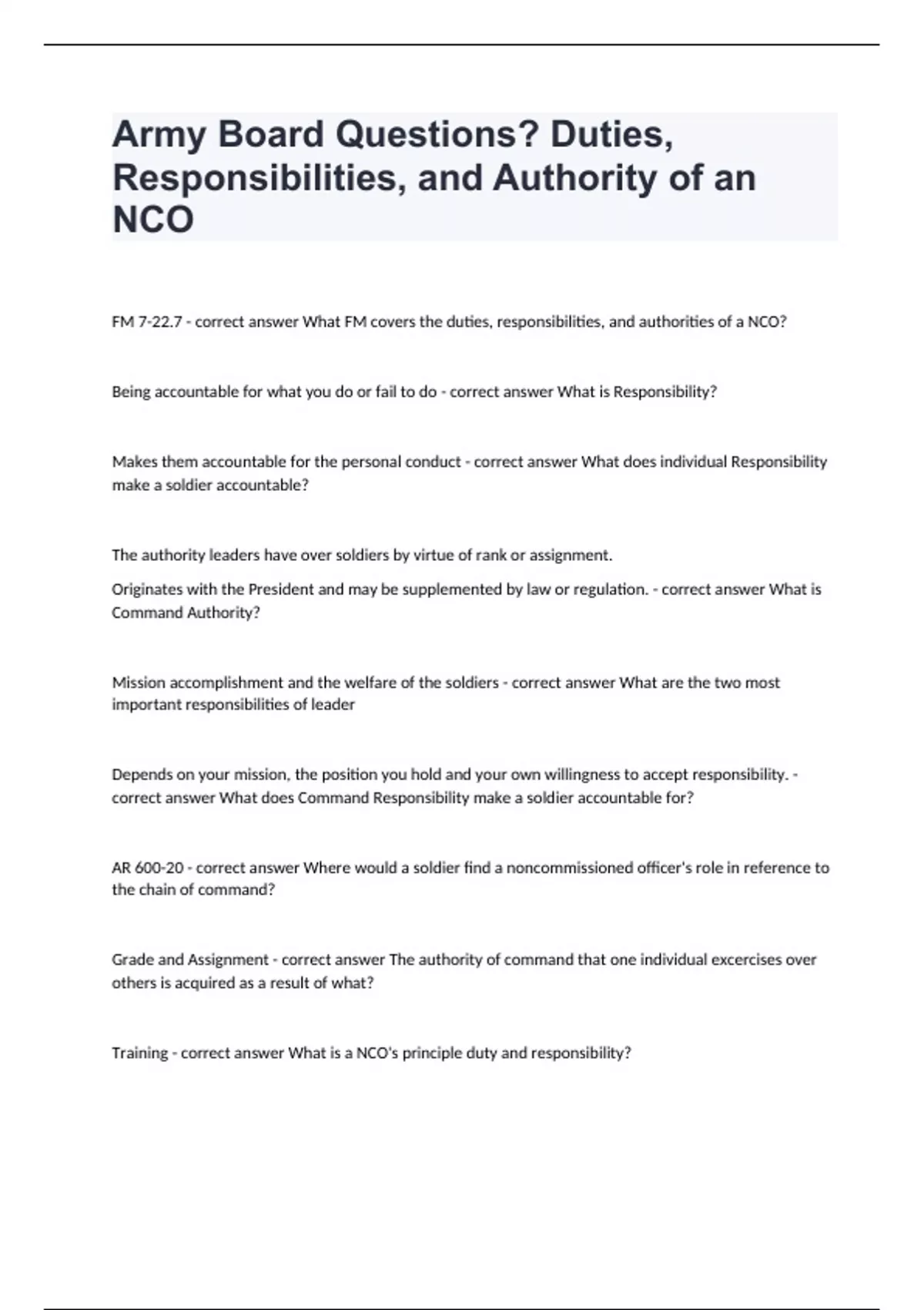 Army Board Questions Duties, Responsibilities, and Authority of an NCO questions with certified 2024