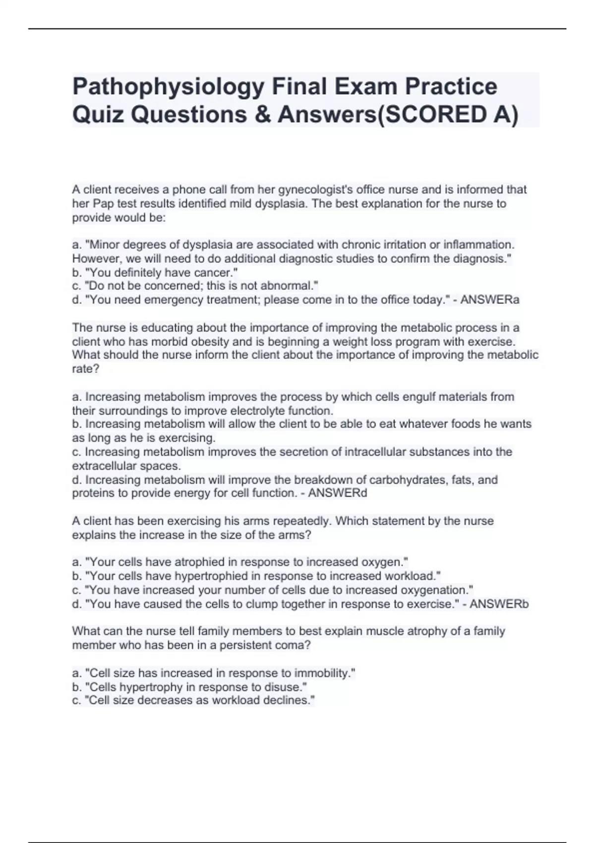 A client receives a phone call from her gynecologist's office nurse and is informed that her Pap test results identified mild dysplasia. The best explanation for the nurse to provide would be: a. "Minor degrees of dysplasia are associated with chronic irritation or inflammation. However, we will need to do additional diagnostic studies to confirm the diagnosis." b. "You definitely have cancer." c. "Do not be concerned; this is not abnormal." d. "You need emergency treatment; please come in to the office today." - ANSWERa The nurse is educating about the importance of improving the metabolic process in a client who has morbid obesity and is beginning a weight loss program with exercise. What should the nurse inform the client about the importance of improving the metabolic rate? a. Increasing metabolism improves the process by which cells engulf materials from their surroundings to improve electrolyte function. b. Increasing metabolism will allow the client to be able to eat whatever foods he wants as long as he is exercising. c. Increasing metabolism improves the secretion of intracellular substances into the extracellular spaces. d. Increasing metabolism will improve the breakdown of carbohydrates, fats, and proteins to provide energy for cell function. - ANSWERd A client has been exercising his arms repeatedly. Which statement by the nurse explains the increase in the size of the arms? a. "Your cells have atrophied in response to increased oxygen." b. "Your cells have hypertrophied in response to increased workload." c. "You have increased your number of cells due to increased oxygenation." d. "You have caused the cells to clump together in response to exercise." - ANSWERb What can the nurse tell family members to best explain muscle atrophy of a family member who has been in a persistent coma? a. "Cell size has increased in response to immobility." b. "Cells hypertrophy in response to disuse." c. "Cell size decreases as workload declines." d. "C