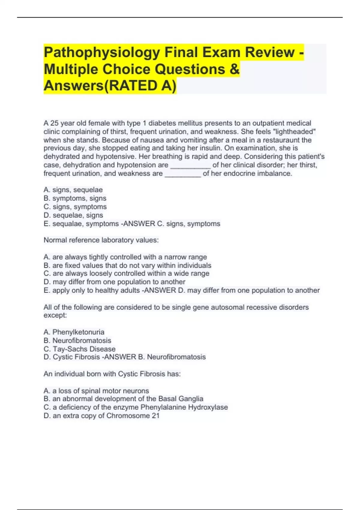 A 25 year old female with type 1 diabetes mellitus presents to an outpatient medical clinic complaining of thirst, frequent urination, and weakness. She feels "lightheaded" when she stands. Because of nausea and vomiting after a meal in a restauraunt the previous day, she stopped eating and taking her insulin. On examination, she is dehydrated and hypotensive. Her breathing is rapid and deep. Considering this patient's case, dehydration and hypotension are __________ of her clinical disorder; her thirst, frequent urination, and weakness are _________ of her endocrine imbalance. A. signs, sequelae B. symptoms, signs C. signs, symptoms D. sequelae, signs E. sequalae, symptoms -ANSWER C. signs, symptoms Normal reference laboratory values: A. are always tightly controlled with a narrow range B. are fixed values that do not vary within individuals C. are always loosely controlled within a wide range D. may differ from one population to another E. apply only to healthy adults -ANSWER D. may differ from one population to another All of the following are considered to be single gene autosomal recessive disorders except: A. Phenylketonuria B. Neurofibromatosis C. Tay-Sachs Disease D. Cystic Fibrosis -ANSWER B. Neurofibromatosis An individual born with Cystic Fibrosis has: A. a loss of spinal motor neurons B. an abnormal development of the Basal Ganglia C. a deficiency of the enzyme Phenylalanine Hydroxylase D. an extra copy of Chromosome 21 E. an ab