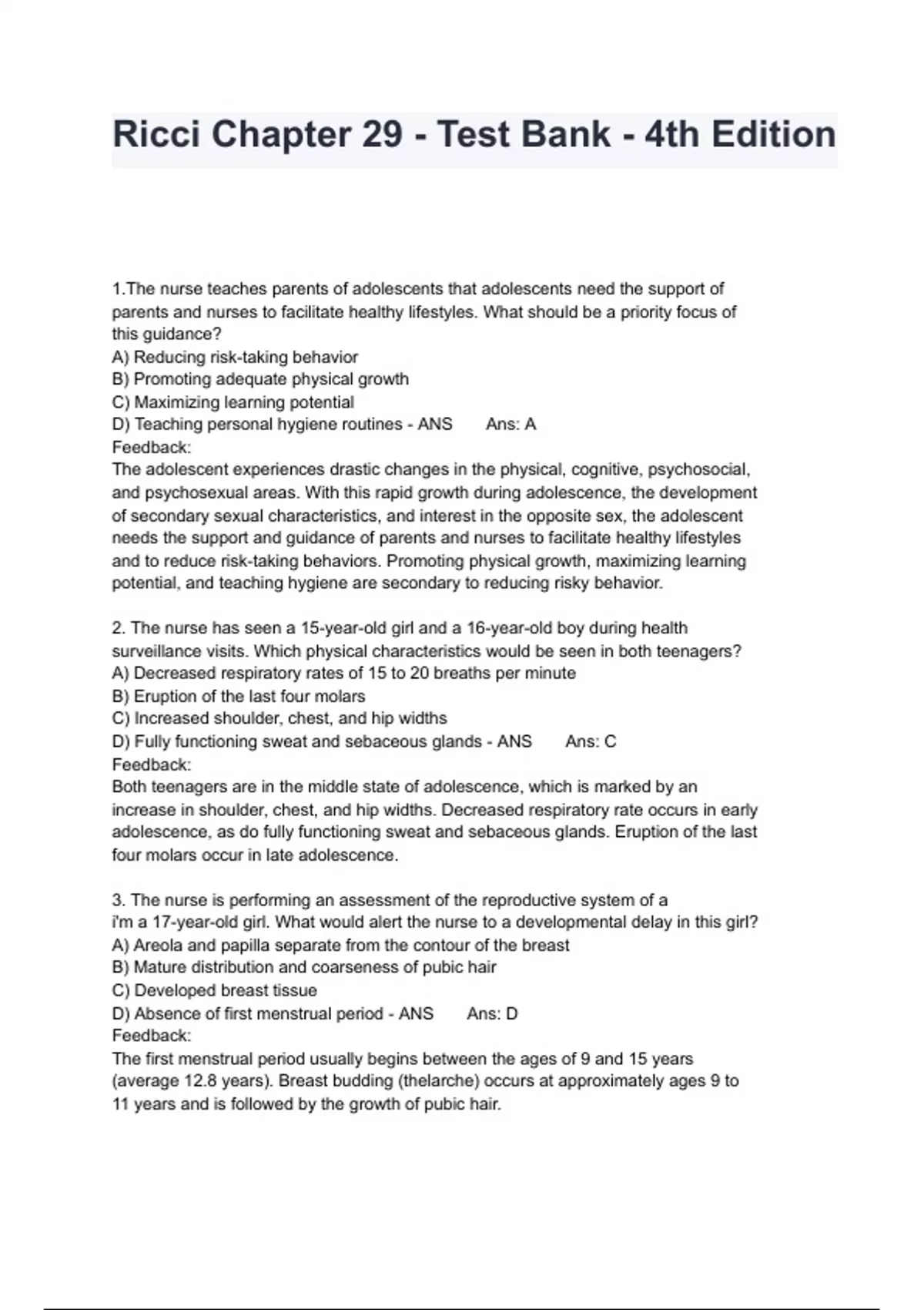 Ricci Chapter 29 - Test Bank - 4th Edition 1.The nurse teaches parents of adolescents that adolescents need the support of parents and nurses to facilitate healthy lifestyles. What should be a priority focus of this guidance? A) Reducing risk-taking behavior B) Promoting adequate physical growth C) Maximizing learning potential D) Teaching personal hygiene routines - ANS Ans: A Feedback: The adolescent experiences drastic changes in the physical, cognitive, psychosocial, and psychosexual areas. With this rapid growth during adolescence, the development of secondary sexual characteristics, and interest in the opposite sex, the adolescent needs the support and guidance of parents and nurses to facilitate healthy lifestyles and to reduce risk-taking behaviors. Promoting physical growth, maximizing learning potential, and teaching hygiene are secondary to reducing risky behavior. 2. The nurse has seen a 15-year-old girl and a 16-year-old boy during health surveillance visits. Which physical characteristics would be seen in both teenagers? A) Decreased respiratory rates of 15 to 20 breaths per minute B) Eruption of the last four molars C) Increased shoulder, chest, and hip widths D) Fully functioning sweat and sebaceous glands - ANS Ans: C Feedback: Both teenagers are in the middle state of adolescence, which is marked by an increase in shoulder, chest, and hip widths. Decreased respiratory rate occurs in early adolescence, as do fully functioning sweat and sebaceous glands. Eruption of the last four molars occur in late adolescence. 3. The nurse is performing an assessment of the reproductive system of a i'm a 17-year-old girl. What would alert the nurse to a developmental delay in this girl? A) Areola and papilla separate from the contour of the breast B) Mature distribution and coarseness of pubic hair C) Developed breast tissue D) Absence of first menstrual period - ANS Ans: D Feedback: The first menstrual period usually begins between the ages of 9 and 15 years (average 12.8 years). Breast budding (thelarche) occurs at approximately ages 9 to 11 years and is followed by the growth of pubic hair. 4. The school nurse is performing health assessments on students in middle school. Of what developmental milestones should the nurse be aware? A) Height in girls increases rapidly after menarche and usually ceases immediately after menarche. B) Boys' growth spurts usually begin between the ages of 8 and 14 years and end between the ages of 131/2 and 171/2 years. C) Peak height velocity (PHV) occurs at approximately 12 years of age in girls or about 6 to 12 months after menarche. D) Boys reach PHV and peak weight velocity (PWV) at about 16 years of age. - ANS Ans: C Feedback: PHV occurs at approximately 12 years of age in girls or about 6 to 12 months after menarche. Height in girls increases rapidly after menarche and usually ceases 2 to 21/2 years after menarche. Boys' growth spurt occurs later than girls' and usually begins between the ages of 101/2 and 16 years and ends sometime between the ages of 131/2 and 171/2 years. Boys reach PHV at about 14 years of age. PWV occurs about 6 months after menarche in girls and at about 14 years of age in boys. 5. After assessing a 10-year-old girl, the nurse documents the appearance of breast buds, identifying this as what body change? A) Menarche B) Thelarche C) Puberty D) Tanner stage 5 - ANS Ans: B Feedback: "Thelarche" is the term used to describe breast budding. Menarche refers to the first menstrual period. Puberty refers to the biologic changes that occur during adolescence. Tanner stage 5 involves maturation of the breast tissue to adult configuration.