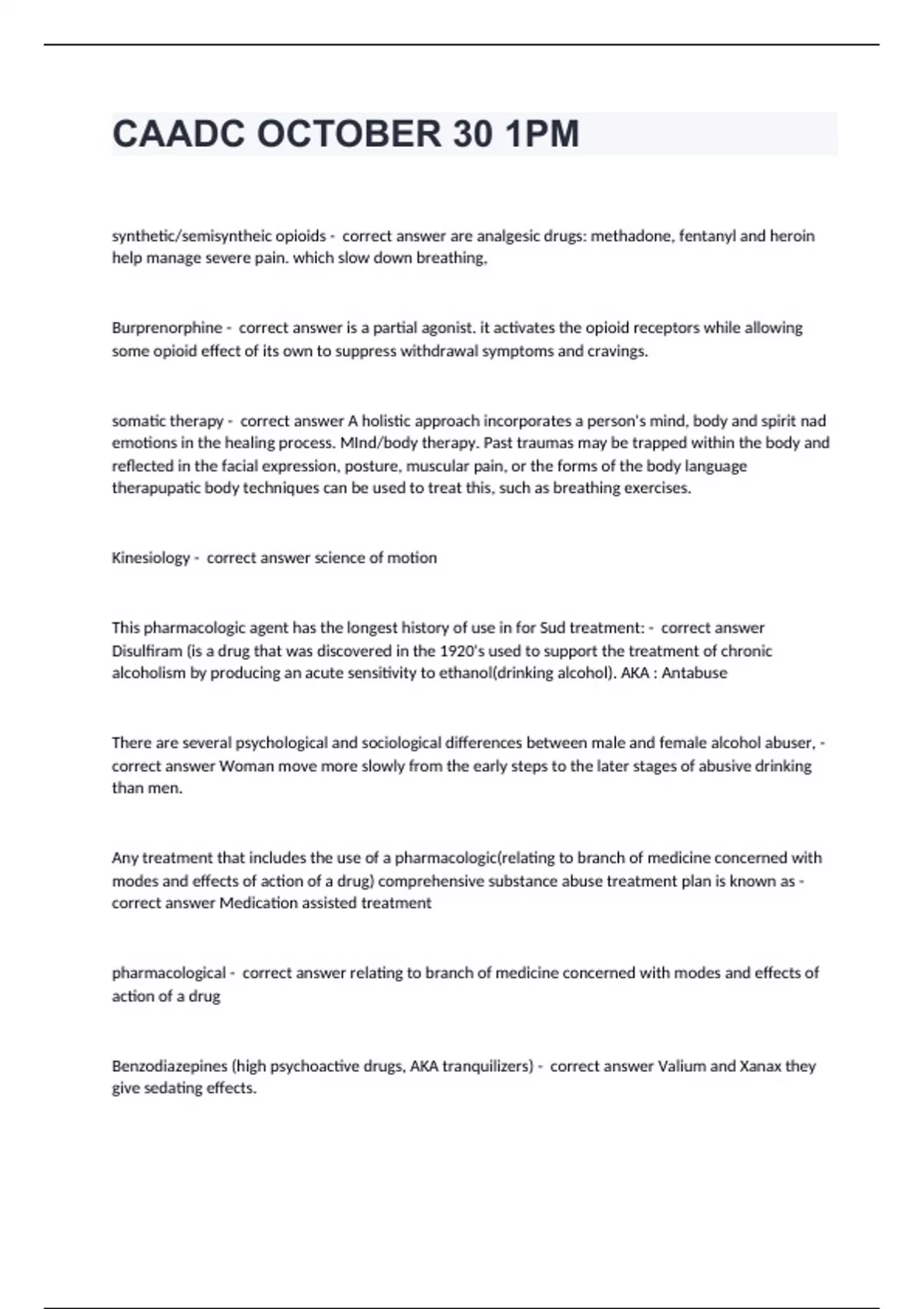 CAADC OCTOBER 30 1PMsynthetic/semisyntheic opioids - correct answer are analgesic drugs: methadone, fentanyl and heroin help manage severe pain. which slow down breathing, Burprenorphine - correct answer is a partial agonist. it activates the opioid receptors while allowing some opioid effect of its own to suppress withdrawal symptoms and cravings. somatic therapy - correct answer A holistic approach incorporates a person's mind, body and spirit nad emotions in the healing process. MInd/body therapy. Past traumas may be trapped within the body and reflected in the facial expression, posture, muscular pain, or the forms of the body language therapupatic body techniques can be used to treat this, such as breathing exercises. Kinesiology - correct answer science of motion This pharmacologic agent has the longest history of use in for Sud treatment: - correct answer Disulfiram (is a drug that was discovered in the 1920's used to support the treatment of chronic alcoholism by producing an acute sensitivity to ethanol(drinking alcohol). AKA : Antabuse There are several psychological and sociological differences between male and female alcohol abuser, - correct answer Woman move more slowly from the early steps to the later stages of abusive drinking than men. Any treatment that includes the use of a pharmacologic(relating to branch of medicine concerned with modes and effects of action of a drug) comprehensive substance abuse treatment plan is known as - correct answer Medication assisted treatment pharmacological - correct answer relating to branch of medicine concerned with modes and effects of action of a drug Benzodiazepines (high psychoactive drugs, AKA tranquilizers) - correct answer Valium and Xanax they give sedating effects.