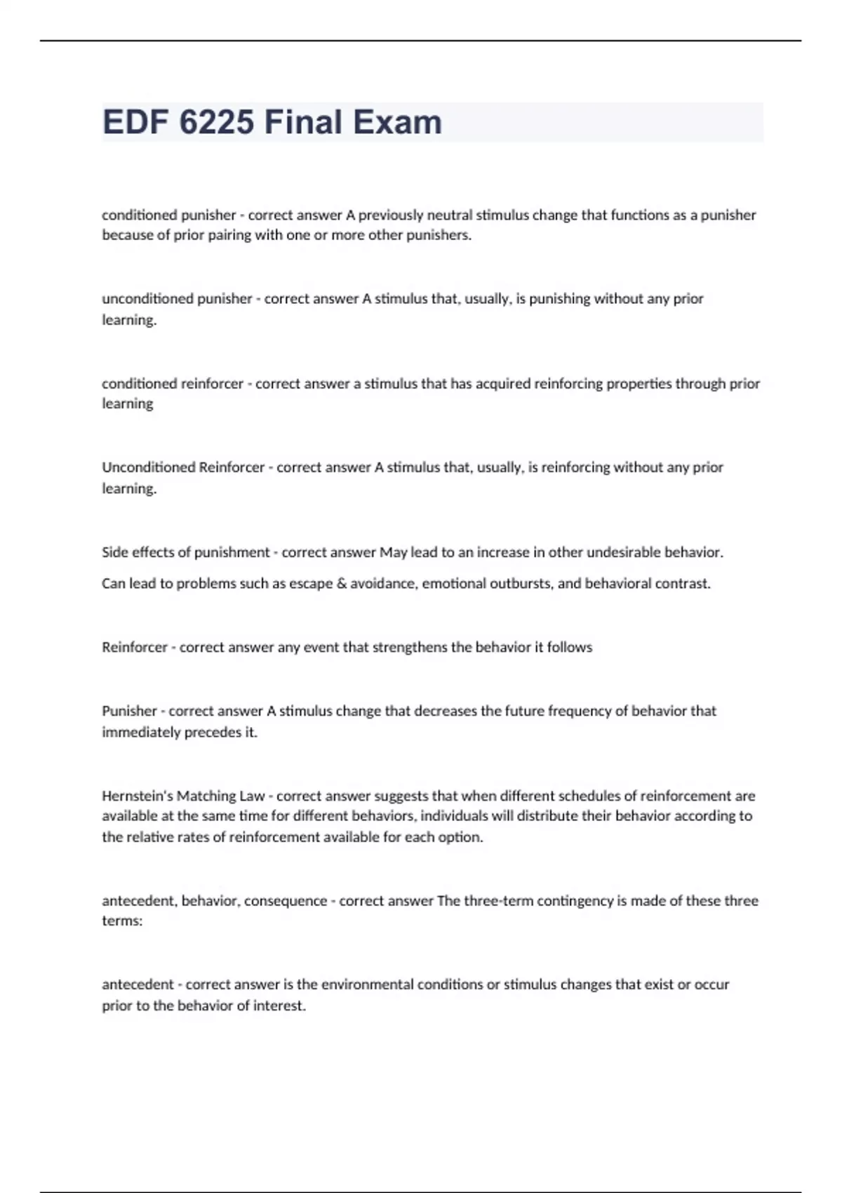 EDF 6225 Final Exam Question and answers already passed 2024 conditioned punisher - correct answer A previously neutral stimulus change that functions as a punisher because of prior pairing with one or more other punishers. unconditioned punisher - correct answer A stimulus that, usually, is punishing without any prior learning. conditioned reinforcer - correct answer a stimulus that has acquired reinforcing properties through prior learning Unconditioned Reinforcer - correct answer A stimulus that, usually, is reinforcing without any prior learning. Side effects of punishment - correct answer May lead to an increase in other undesirable behavior. Can lead to problems such as escape & avoidance, emotional outbursts, and behavioral contrast. Reinforcer - correct answer any event that strengthens the behavior it follows Punisher - correct answe