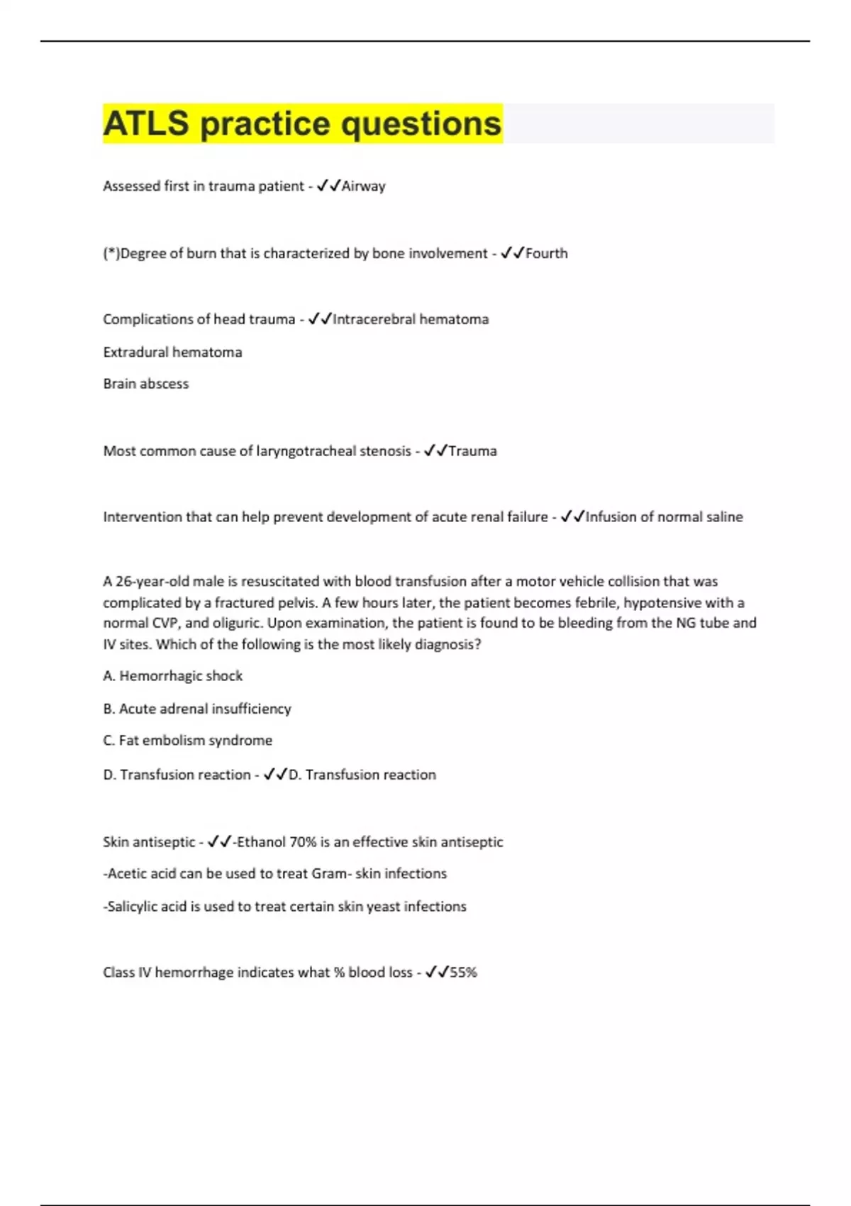 Assessed first in trauma patient - Airway (*)Degree of burn that is characterized by bone involvement - Fourth Complications of head trauma - Intracerebral hematoma Extradural hematoma Brain abscess Most common cause of laryngotracheal stenosis - Trauma Intervention that can help prevent development of acute renal failure - Infusion of normal saline A 26-year-old male is resuscitated with blood transfusion after a motor vehicle collision that was complicated by a fractured pelvis. A few hours later, the patient becomes febrile, hypotensive with a normal CVP, and oliguric. Upon examination, the patient is found to be bleeding from the NG tube and IV sites. Which of the following is the most likely diagnosis? A. Hemorrhagic shock B. Acute adrenal insufficiency C. Fat embolism syndrome D. Transfusion reaction - D. Transfusion reaction Skin antiseptic - -Ethanol 70% is an effective skin antiseptic -Acetic acid can be used to treat Gram- skin infections -Salicylic acid is used to treat certain skin yeast infections Class IV hemorrhage indicates what % blood loss - 55%