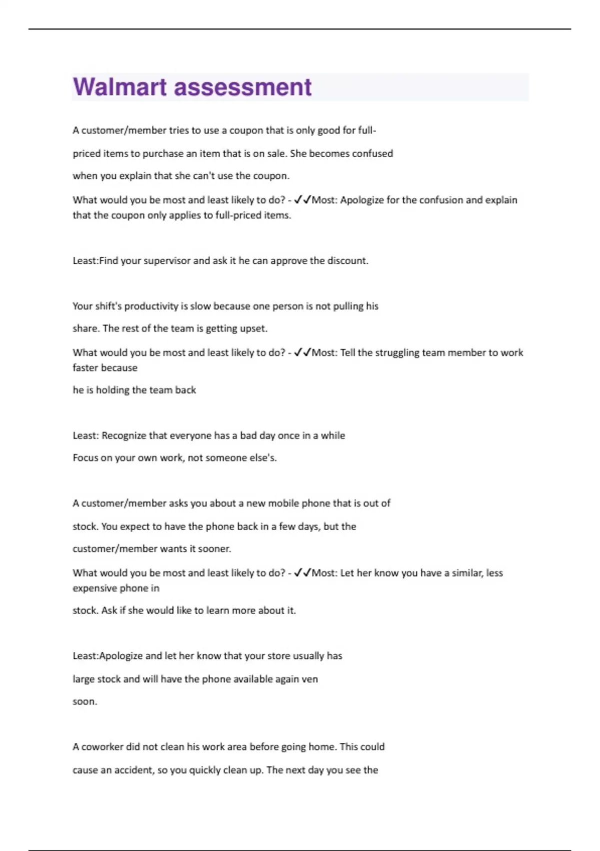 A customer/member tries to use a coupon that is only good for fullpriced items to purchase an item that is on sale. She becomes confused when you explain that she can't use the coupon. What would you be most and least likely to do? - Most: Apologize for the confusion and explain that the coupon only applies to full-priced items. Least:Find your supervisor and ask it he can approve the discount. Your shift's productivity is slow because one person is not pulling his share. The rest of the team is getting upset. What would you be most and least likely to do? - Most: Tell the struggling team member to work faster because he is holding the team back Least: Recognize that everyone has a bad day once in a while Focus on your own work, not someone else's. A customer/member asks you about a new mobile phone that is out of stock. You expect to have the phone back in a few days, but the customer/member wants it sooner. What would you be most and least likely to do? - Most: Let her know you have a similar, less expensive phone in stock. Ask if she would like to learn more about it. Least:Apologize and let her know that your store usually has large stock and will have the phone available again ven soon. A coworker did not clean his work area before going home. This could cause an accident, so you quickly clean up. The next day you see thecoworker. What would you be most and least likely to do? - Most: Tell him he should be more careful because his work area could have resulted in an accident Least: Say nothing to him because the problem has been taken care of Your new team is working hard, but they are all less experienced than you and don't complete their tasks as quickly. What would you be most and least likely to do? - Most: Remind your coworkers of performance expectations and that they need to be working harder to complete tasks Least: Give your coworkers more time to figure out how to do the task; they likely just need more practice with what they've already learned You are working closely with an experienced associate. He insists on completing a task a certain way, but you know there is a more efficient method What would you be most and least likely to do? - Most: Tell him you like to learn more about his technique, Inform him you have other methods that have worked well in the past. Least: Your coworker's method works just fine, avoid upsetting him and compile the tasks You are working to finish an assigned task in order to meet your shift goal when a coworker urgently asks you for help with something you know a lot about.What would you be most and least likely to do? - Most: Ask ypur coworker if it can wait until you are finished with your task because you have a deadline. Least: Tell your coworker that you will help in a few minutes if you can reach a good stopping point. During a busy time at the bakery counter, a loyal customer/member stops you to chat. As he's talking, you notice a customer/member nearby that needs help. What would you be most and least likely to do? - Most Apologias and tell him you see another customer/member