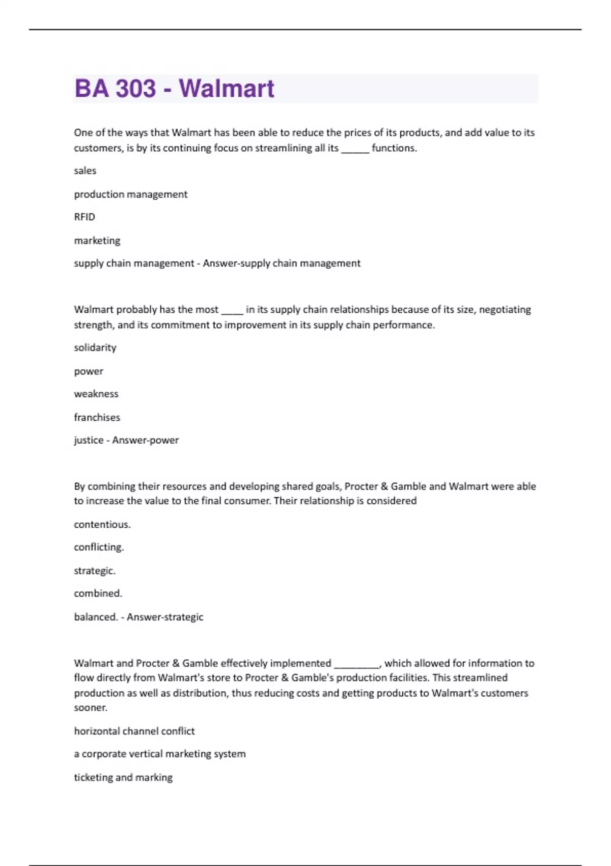 One of the ways that Walmart has been able to reduce the prices of its products, and add value to its customers, is by its continuing focus on streamlining all its _____ functions. sales production management RFID marketing supply chain management - Answer-supply chain management Walmart probably has the most ____ in its supply chain relationships because of its size, negotiating strength, and its commitment to improvement in its supply chain performance. solidarity power weakness franchises justice - Answer-power By combining their resources and developing shared goals, Procter & Gamble and Walmart were able to increase the value to the final consumer. Their relationship is considered contentious. conflicting. strategic. combined. balanced. - Answer-strategic Walmart and Procter & Gamble effectively implemented ________, which allowed for information to flow directly from Walmart's store to Procter & Gamble's production facilities. This streamlined production as well as distribution, thus reducing costs and getting products to Walmart's customers sooner. horizontal channel conflict a corporate vertical marketing system ticketing and markinga new franchise electronic data interchange - Answer-electronic data interchange The strategic relationship between Walmart and Procter & Gamble is based on __________ because both firms realize that investments in supply chain management will create savings for consumers. conflict logistics interdependence independence channel management - Answer-interdependent