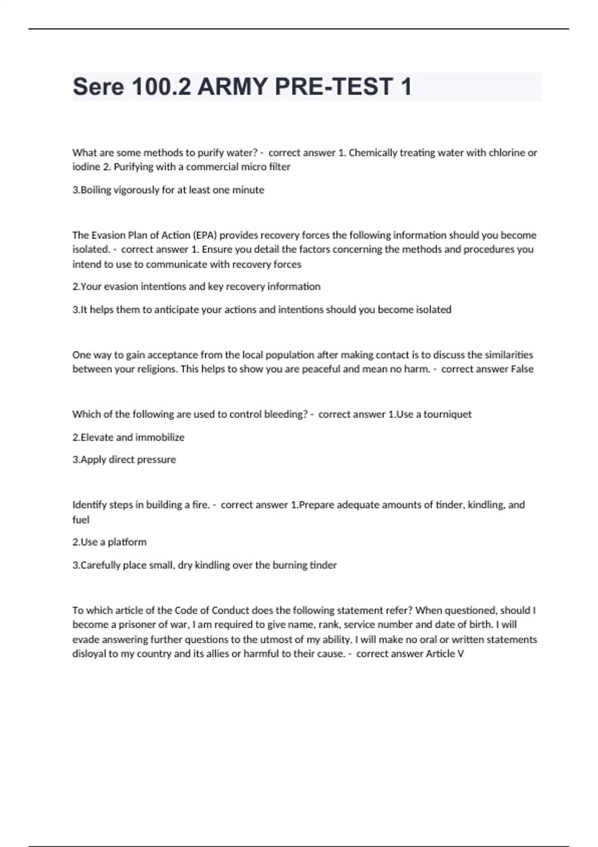 Sere 100.2 ARMY PRE-TEST 1 What are some methods to purify water? - correct answer 1. Chemically treating water with chlorine or iodine 2. Purifying with a commercial micro filter 3.Boiling vigorously for at least one minute The Evasion Plan of Action (EPA) provides recovery forces the following information should you become isolated. - correct answer 1. Ensure you detail the factors concerning the methods and procedures you intend to use to communicate with recovery forces 2.Your evasion intentions and key recovery information 3.It helps them to anticipate your actions and intentions should you become isolated One way to gain acceptance from the local population after making contact is to discuss the similarities between your religions. This helps to show you are peaceful and mean no harm. - correct answer False Which of the following are used to control bleeding? - correct answer 1.Use a tourniquet 2.Elevate and immobilize 3.Apply direct pressure Identify steps in building a fire. - correct answer 1.Prepare adequate amounts of tinder, kindling, and fuel 2.Use a platform 3.Carefully place small, dry kindling over the burning tinder To which article of the Code of Conduct does the following statement refer? When questioned, should I become a prisoner of war, I am required to give name, rank, service number and date of birth. I will evade answering further questions to the utmost of my ability. I will make no oral or written statements disloyal to my country and its allies or harmful to their cause. - correct answer Article V