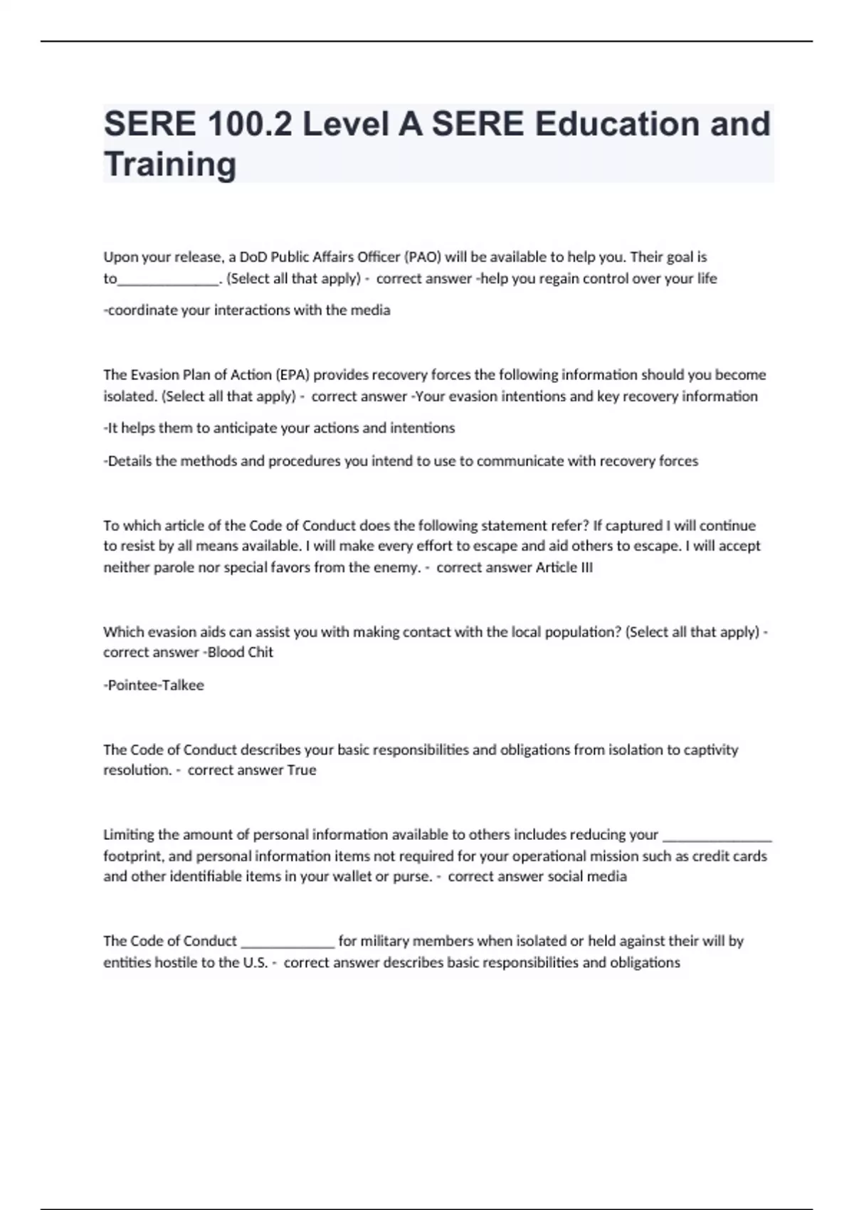 SERE 100.2 Level A SERE Education and TrainingUpon your release, a DoD Public Affairs Officer (PAO) will be available to help you. Their goal is to_____________. (Select all that apply) - correct answer -help you regain control over your life -coordinate your interactions with the media The Evasion Plan of Action (EPA) provides recovery forces the following information should you become isolated. (Select all that apply) - correct answer -Your evasion intentions and key recovery information -It helps them to anticipate your actions and intentions -Details the methods and procedures you intend to use to communicate with recovery forces To which article of the Code of Conduct does the following statement refer? If captured I will continue to resist by all means available. I will make every effort to escape and aid others to escape. I will accept neither parole nor special favors from the enemy. - correct answer Article III Which evasion aids can assist you with making contact with the local population? (Select all that apply) - correct answer -Blood Chit -Pointee-Talkee The Code of Conduct describes your basic responsibilities and obligations from isolation to captivity resolution. - correct answer True Limiting the amount of personal information available to others includes reducing your ______________ footprint, and personal information items not required for your operational mission such as credit cards and other identifiable items in your wallet or purse. - correct answer social media The Code of Conduct ____________ for military members when isolated or held against their will by entities hostile to the U.S. - correct answer describes basic responsibilities and obligations