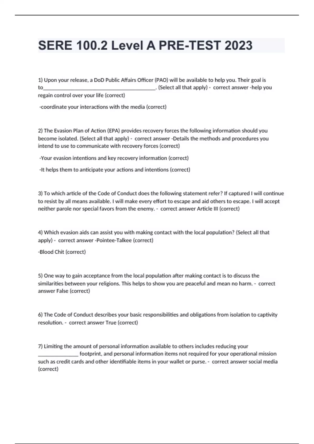 SERE 100.2 Level A PRE-TEST 20231) Upon your release, a DoD Public Affairs Officer (PAO) will be available to help you. Their goal is to_______________________________________. (Select all that apply) - correct answer -help you regain control over your life (correct) -coordinate your interactions with the media (correct) 2) The Evasion Plan of Action (EPA) provides recovery forces the following information should you become isolated. (Select all that apply) - correct answer -Details the methods and procedures you intend to use to communicate with recovery forces (correct) -Your evasion intentions and key recovery information (correct) -It helps them to anticipate your actions and intentions (correct) 3) To which article of the Code of Conduct does the following statement refer? If captured I will continue to resist by all means available. I will make every effort to escape and aid others to escape. I will accept neither parole nor special favors from the enemy. - correct answer Article III (correct) 4) Which evasion aids can assist you with making contact with the local population? (Select all that apply) - correct answer -Pointee-Talkee (correct) -Blood Chit (correct) 5) One way to gain acceptance from the local population after making contact is to discuss the similarities between your religions. This helps to show you are peaceful and mean no harm. - correct answer False (correct) 6) The Code of Conduct describes your basic responsibilities and obligations from isolation to captivity resolution. - correct answer True (correct) 7) Limiting the amount of personal information available to others includes reducing your ______________ footprint, and personal information items not required for your operational mission such as credit cards and other identifiable items in your wallet or purse. - correct answer social media (correct)