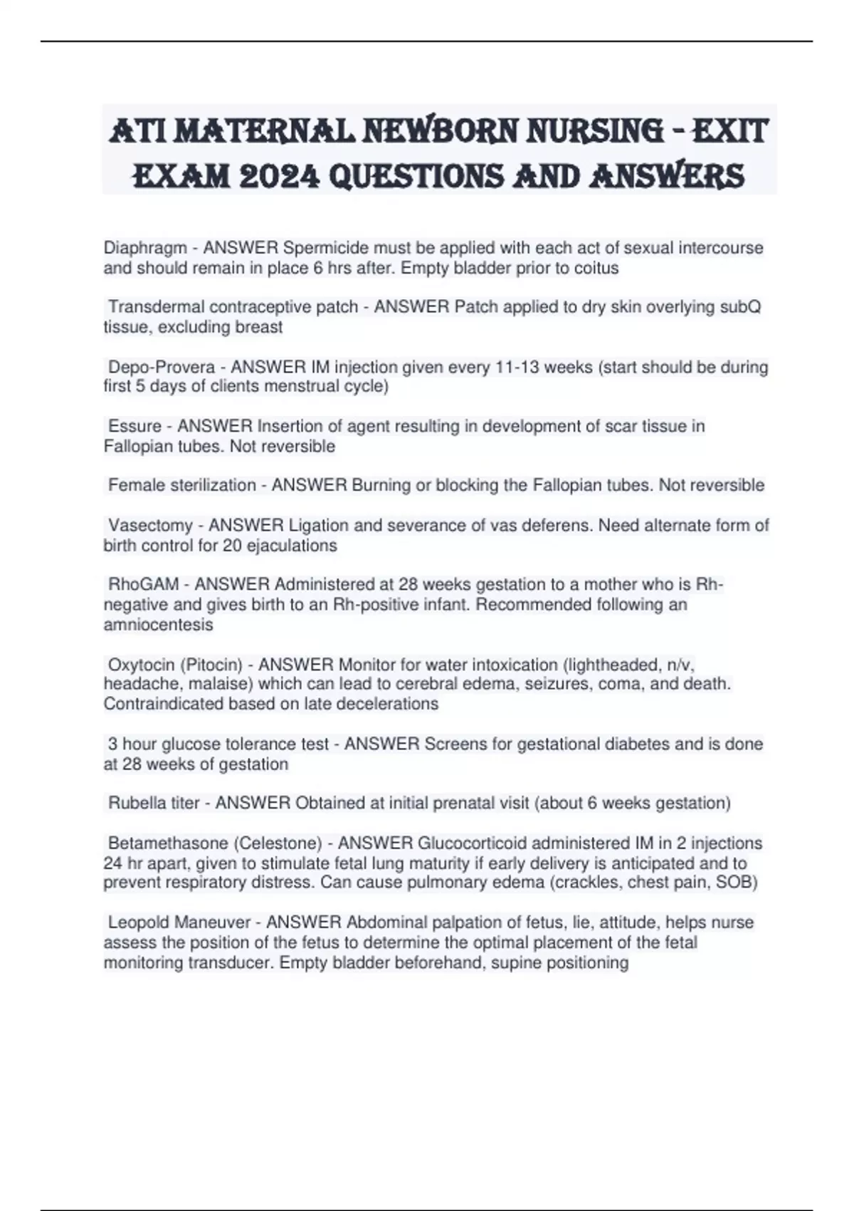 ATI MATERNAL NEWBORN NURSING - EXIT EXAM 2024 QUESTIONS AND ANSWERS Diaphragm - ANSWER Spermicide must be applied with each act of sexual intercourse and should remain in place 6 hrs after. Empty bladder prior to coitus Transdermal contraceptive patch - ANSWER Patch applied to dry skin overlying subQ tissue, excluding breast Depo-Provera - ANSWER IM injection given every 11-13 weeks (start should be during first 5 days of clients menstrual cycle) Essure - ANSWER Insertion of agent resulting in development of scar tissue in Fallopian tubes. Not reversible Female sterilization - ANSWER Burning or blocking the Fallopian tubes. Not reversible Vasectomy - ANSWER Ligation and severance of vas deferens. Need alternate form of birth control for 20 ejaculations RhoGAM - ANSWER Administered at 28 weeks gestation to a mother who is Rhnegative and gives birth to an Rh-positive infant. Recommended following an amniocentesis Oxytocin (Pitocin) - ANSWER Monitor for water intoxication (lightheaded, n/v, headache, malaise) which can lead to cerebral edema, seizures, coma, and death. Contraindicated based on late decelerations 3 hour glucose tolerance test - ANSWER Screens for gestational diabetes and is done at 28 weeks of gestation Rubella titer - ANSWER Obtained at initial prenatal visit (about 6 weeks gestation) Betamethasone (Celestone) - ANSWER Glucocorticoid administered IM in 2 injections 24 hr apart, given to stimulate fetal lung maturity if early delivery is anticipated and to prevent respiratory distress. Can cause pulmonary edema (crackles, chest pain, SOB) Leopold Maneuver - ANSWER Abdominal palpation of fetus, lie, attitude, helps nurse assess the position of the fetus to determine the optimal placement of the fetal monitoring transducer. Empty bladder beforehand, supine positioning Steps of Leopold Maneuver - ANSWER Palpate client's fundus, determine location of fetal back, palpate fetal part presenting at the inlet, and palpate the cephalic prominence to identify the attitude of the head Ferning test - ANSWER If positive, indicates rupture of membranes Expected newborn temp - ANSWER 36.5-37.2 Expected newborn HR - ANSWER 120-160 Expected newborn RR - ANSWER 30-60 Expected newborn BP - ANSWER 60-80 S, 40-50 D Expected newborn length - ANSWER 45-55 cm Expected newborn weight - ANSWER 2,500-4,000 g What is effleurage? - ANSWER Client strokes abdomen using circular motion during contractions Maternal Serum Alpha-Fetoprotein - ANSWER Screening tool for neural tube defects that is effective between 15 and 22 weeks. levels above indicate the need for an ultrasound Position for transvaginal ultrasound - ANSWER Lithotomy position Biophysical profile assesses? - ANSWER Fetal HR, breathing, body movements, fetal tone, and qualitative amniotic fluid volume What does biophysical profile indicate? - ANSWER The risk of asphyxia Nonstress test - ANSWER Client presses a button whenever they feel fetal movement which allows nurse to assess FHR in relationship to the fetal movement Reactive stress test - ANSWER FHR has moderate variability, accelerated to 15 beats/min for at least 15 seconds and occurs two or more times during a 20 minute period Nonreactive stress test - ANSWER FHR does not accelerate adequately with fetal movement. Does not meet criteria after 40 minutes. Contraction stress test or biophysical profile is indicated Contraction stress test - ANSWER FHR in response to contractions which decreases placental blood flow Amniocentesis - ANSWER Performed after 14 weeks gestation, empty bladder beforehand, client in supine position High levels of AFP - ANSWER Alpha-Fetoprotein is measured between 16 and 18 weeks and is used to detect neural tube defects (anencephaly), spina bifida, and omphalocele Low levels AFP - ANSWER Chromosomal disorders (Down syndrome) Fetal lung tests - ANSWER Lecithin/sphingomyelin ratio- 2:1 indicating lung maturity or 3:1 for diabetes mellitus Percutaneous blood sampling - ANSWER Obtains fetal blood from umbilical cord which evaluates isoimmune fetal hemolytic anemia and assesses need for fetal blood transfusion Chorionic Villus sampling - ANSWER Alternative to amniocentesis (10-12 weeks gestation)