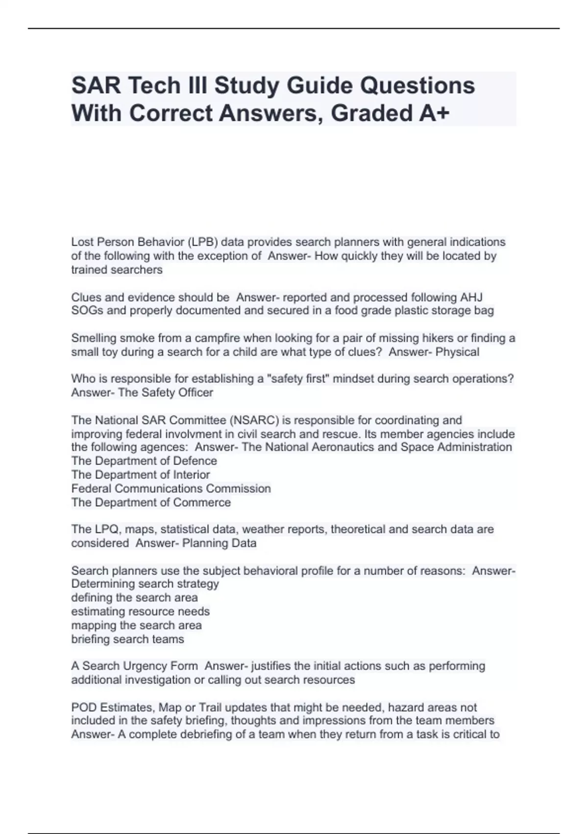 SAR Tech III Study Guide Questions With Correct Answers, Graded A+