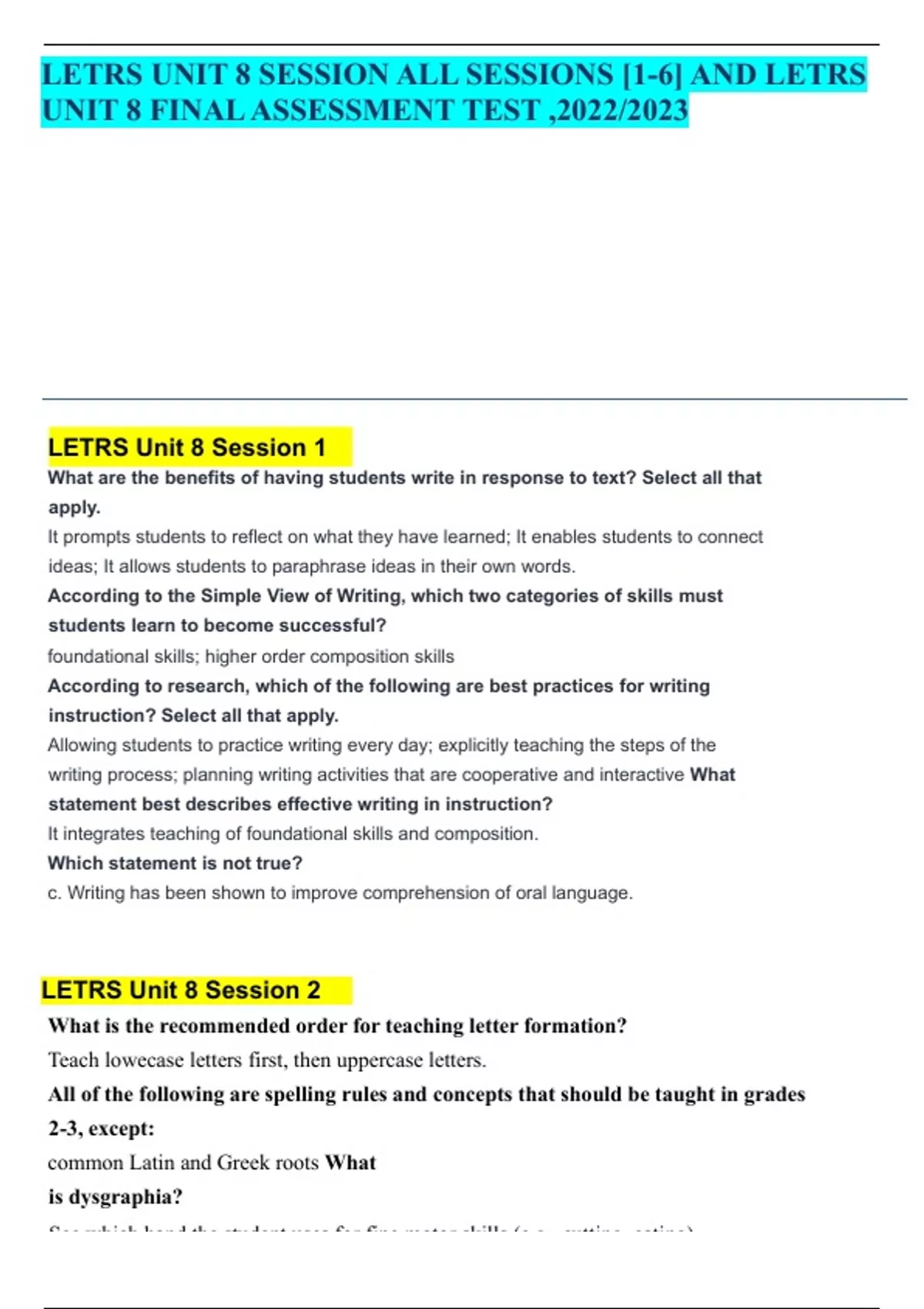 LETRS UNIT 8 SESSION ALL SESSIONS [1-6] AND LETRS UNIT 8 FINAL ASSESSMENT TEST ,2022/2023