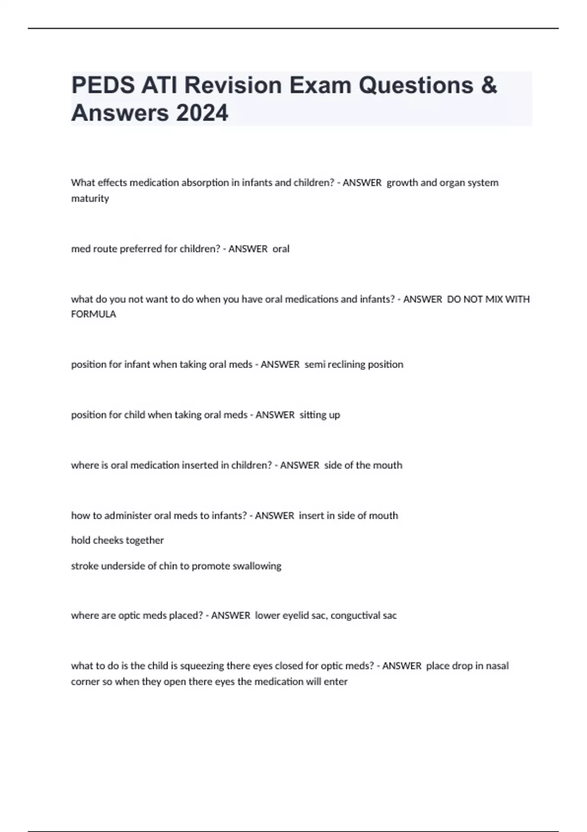 PEDS ATI Revision Exam Questions & Answers 2024 What effects medication absorption in infants and children? growth and organ system maturity med route preferred for children? oral what do you not want to do when you have oral medications and infants? DO NOT MIX WITH FORMULA position for infant when taking oral meds semi reclining position