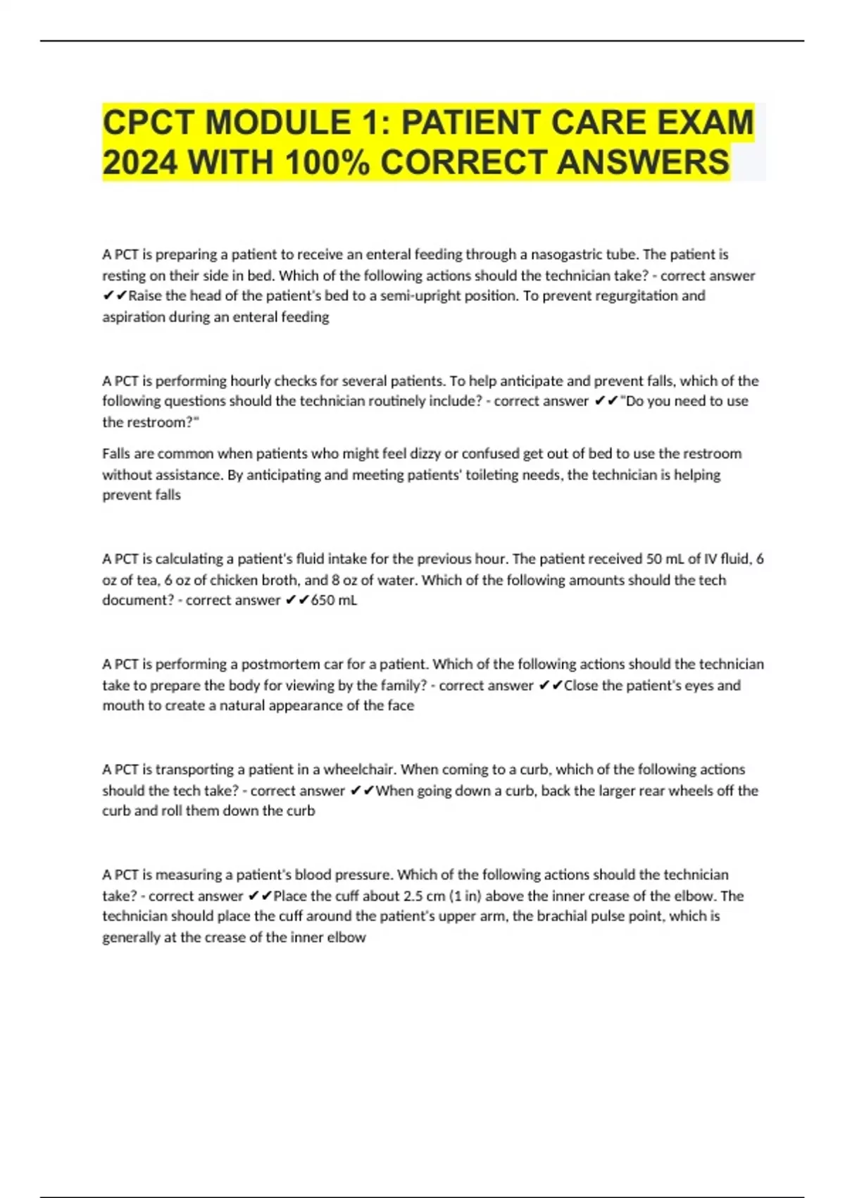 CPCT MODULE 1: PATIENT CARE EXAM 2024 WITH 100% CORRECT ANSWERS