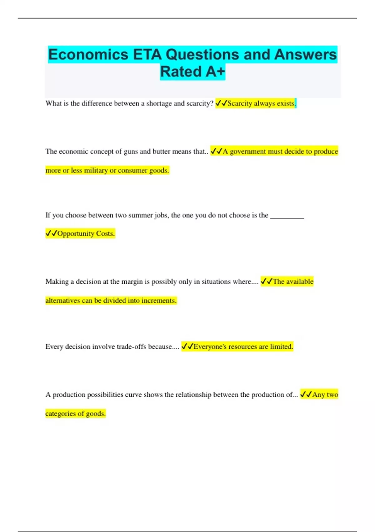 Economics ETA Questions and Answers Rated A+ What is the difference between a shortage and scarcity? Scarcity always exists. The economic concept of guns and butter means that.. A government must decide to produce more or less military or consumer goods. If you choose between two summer jobs, the one you do not choose is the _________ Opportunity Costs. Making a decision at the margin is possibly only in situations where.... The available alternatives can be divided into increments. Every decision involve trade-offs because.... Everyone's resources are limited. A production possibilities curve shows the relationship between the production of... Any two categories of goods. The line on a production possibilities curve showing the relative amounts of two types of goods produced using all resources is called the.... Production possibilities frontier. An economy that is producing the maximum amount of goods and services is considered..... Efficient. Increasing the number of laborers or an improvement in technology will shift the PPC... To the right. The graph shows how many new schools and new roads a city can build using all of its resources. What trend does the graph show? The number of new roads has no effect on the number of new schools. How did an improvement in the technology for producing digital cameras affect supply? The supply curve moved to the right. When is a market a equilibrium? When quantity demanded equals quantity supplied. Which newspaper headline will most likely shift the demand curve for flu shots to the right? Health Experts Predict Several Flu Seasons Ahead. Students are publishing a magazine at their school. How many copies should they print? What price should they charge for each