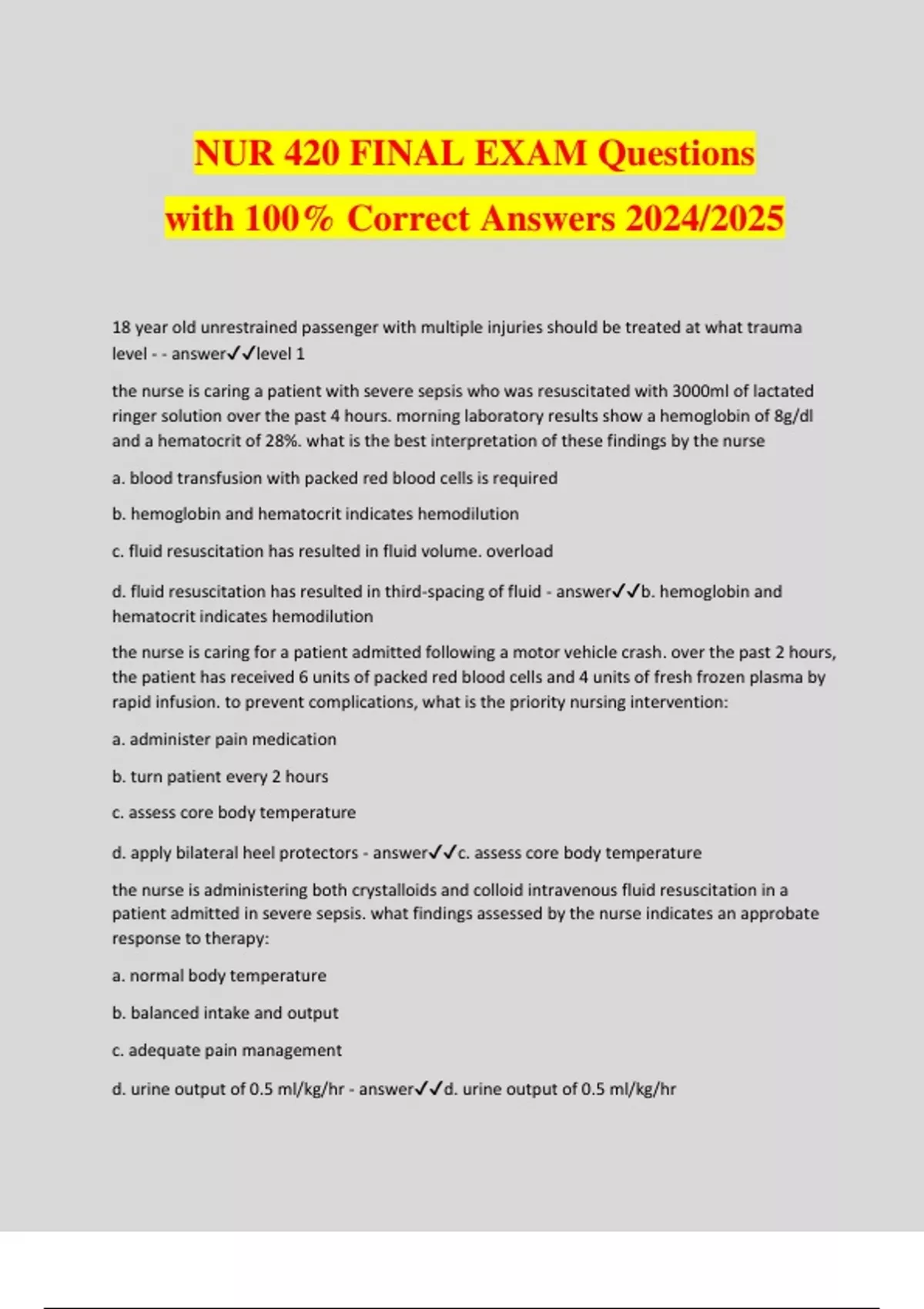 NUR 420 FINAL EXAM Questions with 100% Correct Answers 2024/2025 18 year old unrestrained passenger with multiple injuries should be treated at what trauma level - - answerlevel 1 the nurse is caring a patient with severe sepsis who was resuscitated with 3000ml of lactated ringer solution over the past 4 hours. morning laboratory results show a hemoglobin of 8g/dl and a hematocrit of 28%. what is the best interpretation of these findings by the nurse a. blood transfusion with packed red blood cells is required b. hemoglobin and hematocrit indicates hemodilution c. fluid resuscitation has resulted in fluid volume. overload d. fluid resuscitation has resulted in third-spacing of fluid - answerb. hemoglobin and hematocrit indicates hemodilution the nurse is caring for a patient admitted following a motor vehicle crash. over the past 2 hours, the patient has received 6 units of packed red blood cells and 4 units of fresh frozen plasma by rapid infusion. to prevent complications, what is the priority nursing intervention: a. administer pain medication b. turn patient every 2 hours c. assess core body temperature d. apply bilateral heel protectors - answerc. assess core body temperature the nurse is administering both crystalloids and colloid intravenous fluid resuscitation in a patient admitted in severe sepsis. what findings assessed by the nurse indicates an approbate response to therapy: a. normal body temperature b. balanced intake and output c. adequate pain management d. urine output of 0.5 ml/kg/hr - answerd. urine output of 0.5 ml/kg/hr the nurse is caring for a patient admitted with the early stages of septic shock. the nurse assesses the patient to be tachypneic, with a respiratory rate of 32 breaths/min. arterial blood gas values assessed on admission are pH 7.50, CO2 28 mm Hg, HCO3 26. which diagnostic study result reviewed by the nurse indicates progression of the shock state? a. pH 7.40, CO2 40, HCO3 24 b. pH 7.45, CO2 45, HCO3 26 c. pH 7.35, CO2 40, HCO3 22 d. pH 7.30, CO2 45, HCO3 18 - answerd. pH 7.30, CO2 45, HCO3 18 trauma nurse is common for the older trauma client - - answerfalls are leading cause of death, physiology is a good indication of outcome, & hypotension in the elderly (chronic disease not effect & fractured hips are uncommon) fluid resuscitation what do you monitor / whats trending - - answerserum lactate levels admitted client who fell from the 1st floor and smells of alcohol begins vomiting - - answerprepare to suction while holding spine immobilization the nurse is caring for a patient who has diminished level of consciousness and who is mechanically ventilated. while performing endotracheal suctioning, the patient reaches up in attempt to grab the suction catheter. what is the best interpretation by the nurse: a. the patient is exhibiting extension posturing b. the patient is exhibiting flexion posturing c. the patent is exhibiting purposeful movement d. the patient is withdrawing to stimulation - answerc. the patent is exhibiting purposeful movement while caring for a patient with a traumatic brain injury, the nurse assesses an ICP of 20 mmHg and a CPPof 85 mmHg. what is the best interperation by the nurse: a. both pressures are high b. both pressures are low c. ICP is high; CPP is normal d. ICP is high; CPP is low - answerc. ICP is high; CPP is normal the nurse is caring for a patient admitted with shock. the nurse understands which assessment finds the best assess tissue perfusion in a patient in shock? (select all that apply) a. blood pressure b. heart rate c. level of consciousness d. pupil response e. respirations f. urine output - answera. blood pressure c. level of consciousness f. urine output while caring for a patient with a basilar skull fracture, the nurse assess clear drainage from the patients left nares. what is the best nursing action: a. have the patient blow the nose until clear b. insert bilateral cotton nasal packing c. place a nasal drip pad under the nose d. suction the left nares until the drainage clears - answerc. place a nasal drip pad under the nose a patient with a head injury has an intracranial pressure (ICP) of 18 mmHg. the blood pressure is 144/90 mmHg, and mean arterial pressure (MAP) is 108 mmHg. what is the cerebral perfusion pressure (CPP): a. 54 mmHg b. 72 mmHg c. 90 mmHg d. 126 mmHg - answerc. 90 mmHg which patient being cared for in the emergency department is most at risk for developing hypovolemic shock? a. a patient admitted with abdominal pain and an elevated white blood cell count b. a patient with a temperature of 102° F and a general dermal rash c. a patient with a 2-day history of nausea, vomiting, and diarrhea d. a patient with slight rectal bleeding from inflamed hemorrhoids - answerc. a patient with a 2-day history of nausea, vomiting, and diarrhea