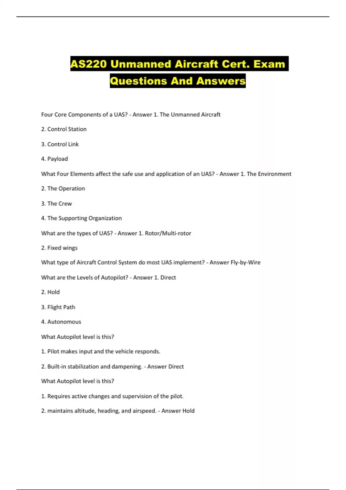 AS220 Unmanned Aircraft Cert. Exam Questions And Answers...