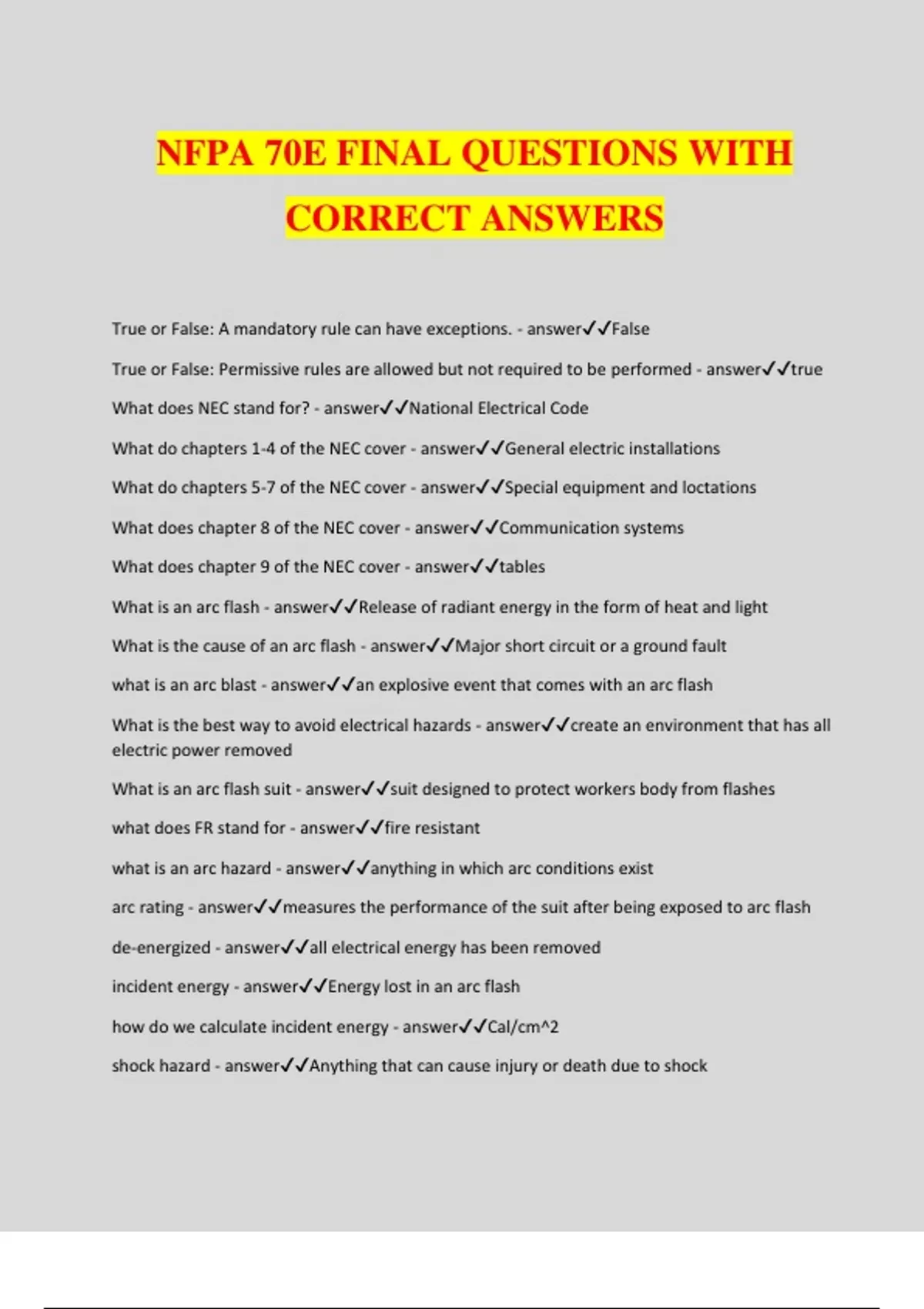 NFPA 70E FINAL QUESTIONS WITH CORRECT ANSWERS True or False: A mandatory rule can have exceptions. - answerFalse True or False: Permissive rules are allowed but not required to be performed - answertrue What does NEC stand for? - answerNational Electrical Code What do chapters 1-4 of the NEC cover - answerGeneral electric installations What do chapters 5-7 of the NEC cover - answerSpecial equipment and loctations What does chapter 8 of the NEC cover - answerCommunication systems What does chapter 9 of the NEC cover - answertables What is an arc flash - answerRelease of radiant energy in the form of heat and light What is the cause of an arc flash - answerMajor short circuit or a ground fault what is an arc blast - answeran explosive event that comes with an arc flash What is the best way to avoid electrical hazards - answercreate an environment that has all electric power removed
