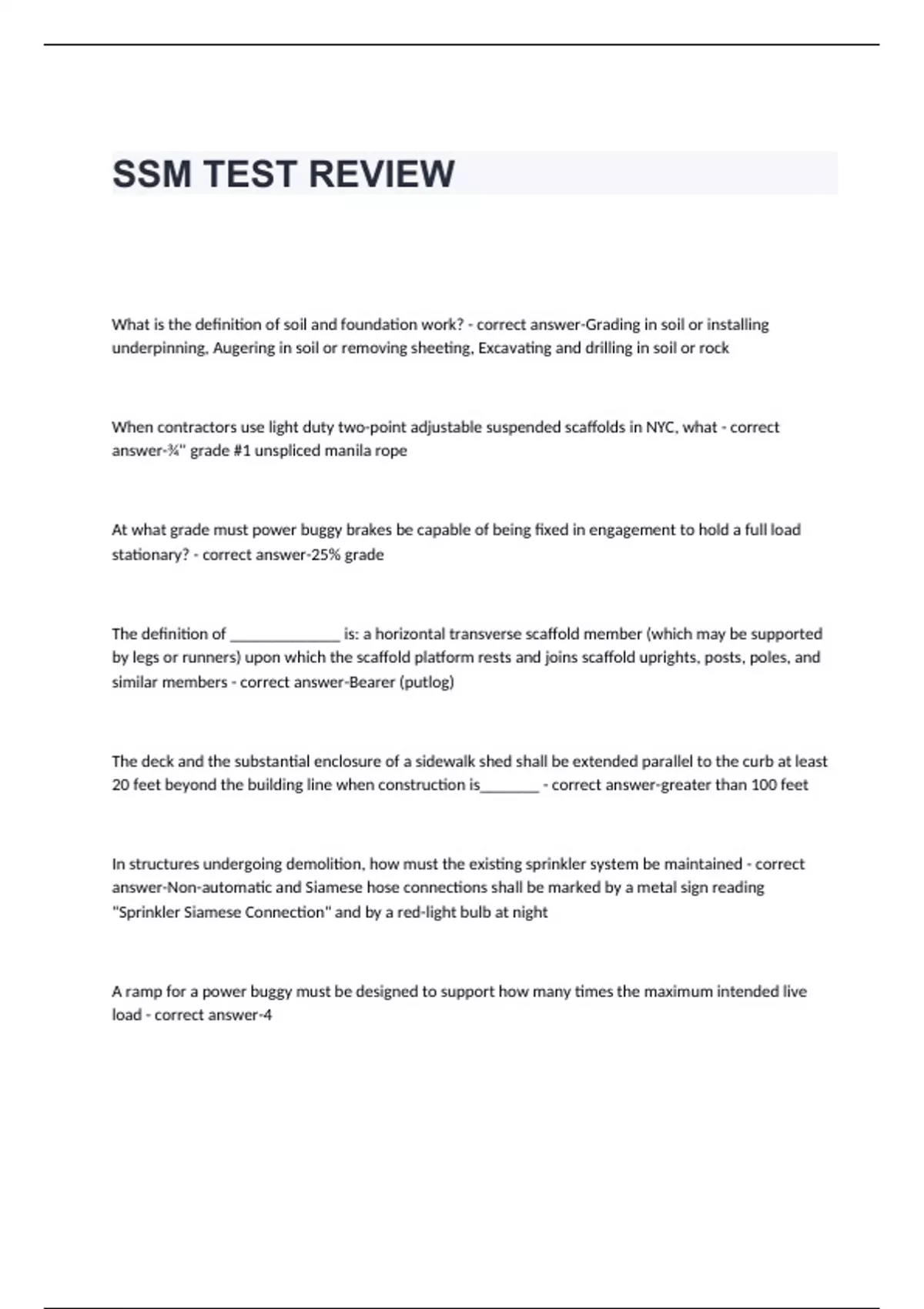 What is the definition of soil and foundation work? - correct answer-Grading in soil or installing underpinning, Augering in soil or removing sheeting, Excavating and drilling in soil or rock When contractors use light duty two-point adjustable suspended scaffolds in NYC, what - correct answer-¾'' grade #1 unspliced manila rope At what grade must power buggy brakes be capable of being fixed in engagement to hold a full load stationary? - correct answer-25% grade The definition of _____________ is: a horizontal transverse scaffold member (which may be supported by legs or runners) upon which the scaffold platform rests and joins scaffold uprights, posts, poles, and similar members - correct answer-Bearer (putlog) The deck and the substantial enclosure of a sidewalk shed shall be extended parallel to the curb at least 20 feet beyond the building line when construction is_______ - correct answer-greater than 100 feet In structures undergoing demolition, how must the existing sprinkler system be maintained - correct answer-Non-automatic and Siamese hose connections shall be marked by a metal sign reading "Sprinkler Siamese Connection" and by a red-light bulb at night A ramp for a power buggy must be designed to support how many times the maximum intended live load - correct answer-4