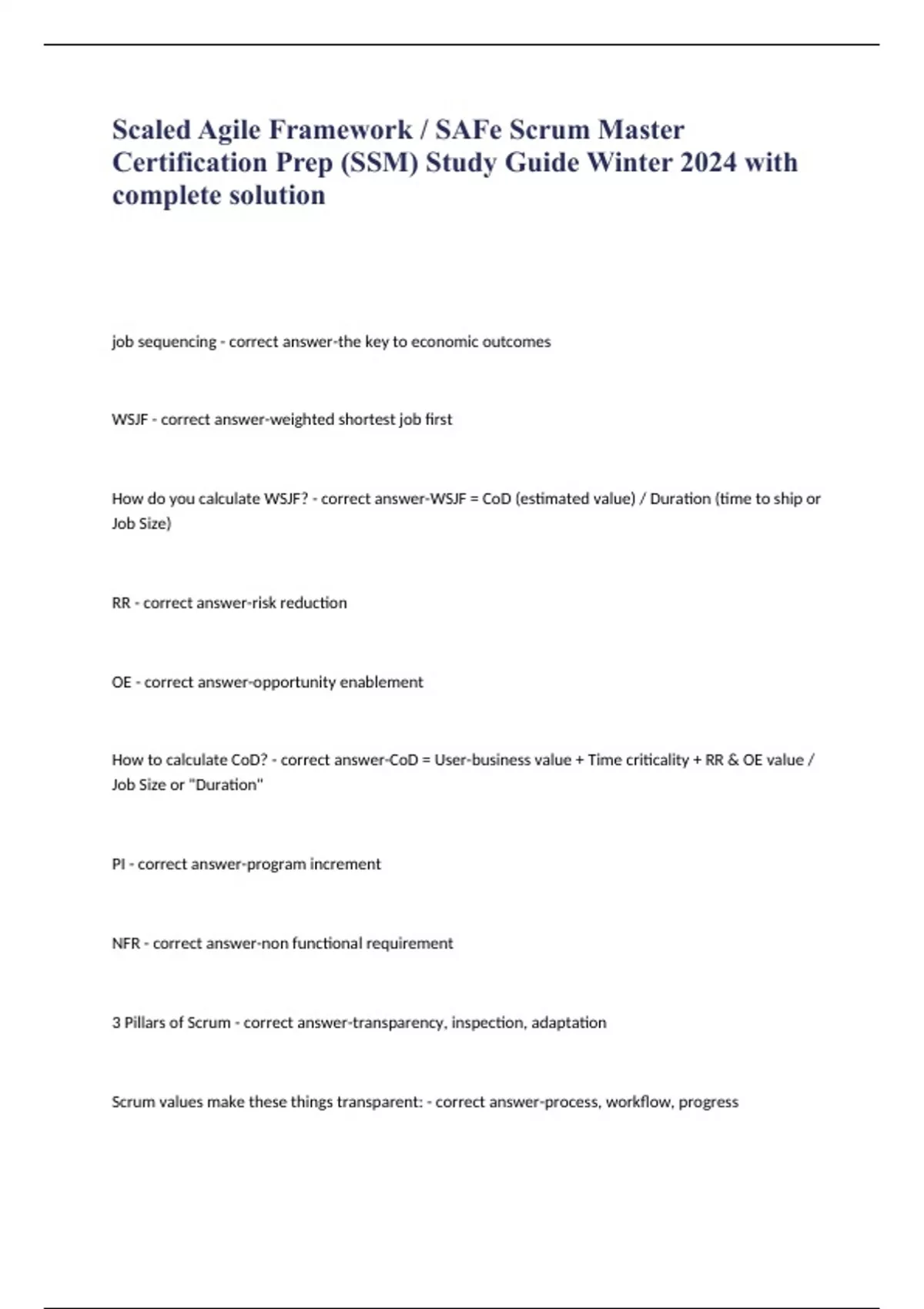 Scaled Agile Framework / SAFe Scrum Master Certification Prep (SSM) Study Guide Winter 2024 with complete solution
