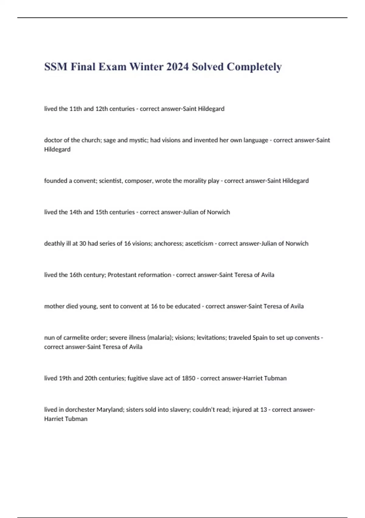 lived the 11th and 12th centuries - correct answer-Saint Hildegard doctor of the church; sage and mystic; had visions and invented her own language - correct answer-Saint Hildegard founded a convent; scientist, composer, wrote the morality play - correct answer-Saint Hildegard lived the 14th and 15th centuries - correct answer-Julian of Norwich deathly ill at 30 had series of 16 visions; anchoress; asceticism - correct answer-Julian of Norwich lived the 16th century; Protestant reformation - correct answer-Saint Teresa of Avila mother died young, sent to convent at 16 to be educated - correct answer-Saint Teresa of Avila nun of carmelite order; severe illness (malaria); visions; levitations; traveled Spain to set up convents - correct answer-Saint Teresa of Avila lived 19th and 20th centuries; fugitive slave act of 1850 - correct answer-Harriet Tubman lived in dorchester Maryland; sisters sold into slavery; couldn't read; injured at 13 - correct answer-Harriet Tubman married freed black man; prayed for god to kill her master; sent coded messages though song; ended up in Philadelphia - correct answer-Harriet Tubman liberated family; led 13 trips to Maryland liberating 70 people; kept herself mf strapped; nickname Moses - correct answer-Harriet Tubman lived 19th and 20th centuries; catholic worker movement; suffrage movement - correct answer-Dorothy Day activist, journalist; converted to Roman Catholicism; catholic worker movement; distribution and pacifism - correct answer-Dorothy Day lived - correct answer-Elizabeth Seton a woman who lived in seclusion, usually for religious reasons - correct answer-anchoress