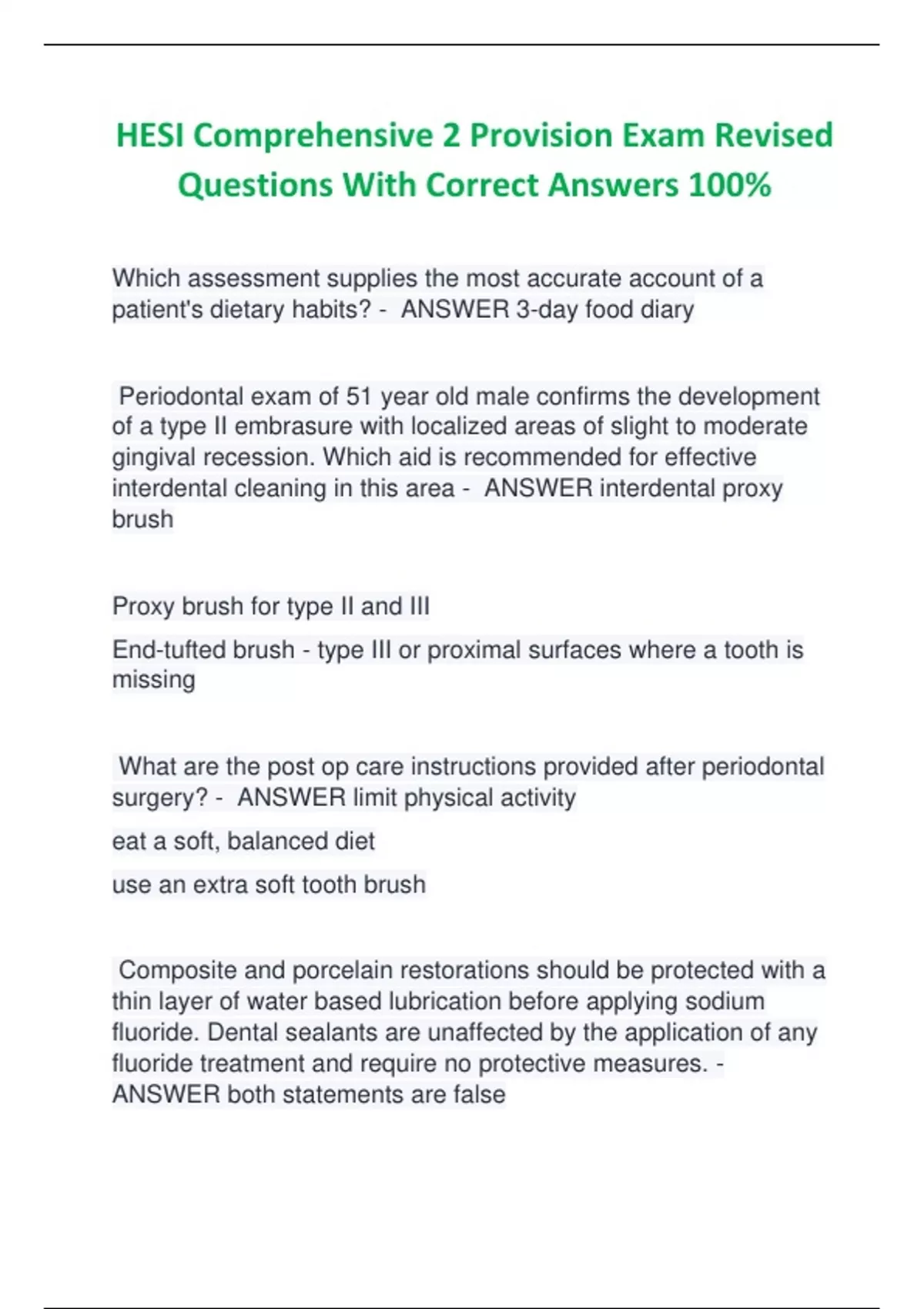 HESI Comprehensive 2 Provision Exam Revised Questions With Correct Answers 100% Which assessment supplies the most accurate account of a patient's dietary habits? - ANSWER 3-day food diary Periodontal exam of 51 year old male confirms the development of a type II embrasure with localized areas of slight to moderate gingival recession. Which aid is recommended for effective interdental cleaning in this area - ANSWER interdental proxy brush Proxy brush for type II and III End-tufted brush - type III or proximal surfaces where a tooth is missing What are the post op care instructions provided after periodontal surgery? - ANSWER limit physical activity eat a soft, balanced diet use an extra soft tooth brush Composite and porcelain restorations should be protected with a thin layer of water based lubrication before applying sodium fluoride. Dental sealants are unaffected by the application of any fluoride treatment and require no protective measures. - ANSWER both statements are false Sealants, composites resins, and porcelain restorations should be protected with a water based lubricant prior to APF fluoride treatment. Which statement is true regarding the purpose of polishing teeth? - ANSWER considered a cosmetic procedure What is the most appropriate radiographic recommendation for a patient presenting with extensive dental work and at risk for decay? - ANSWER a full mouth periapical series